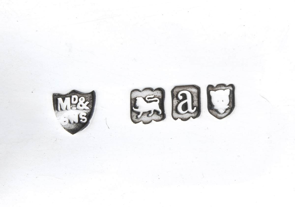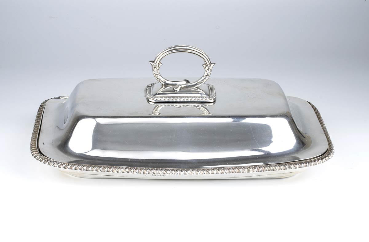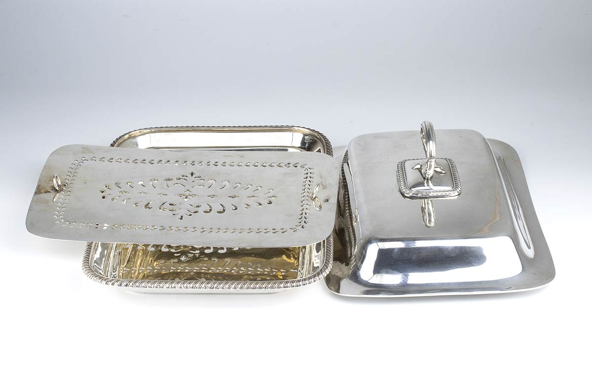 di forma rettangolare con bordo godronato. La vaschetta di scolo interna sopra il vassoio consente agli asparagi di rimanere consistenti e caldi con l'aggiunta di acqua calda nello scomparto più in basso. La legumiera può essere utilizzata anche senza il vassoio interno. Argento 925/1000, serie completa di marchi Londra 1896-1897, argentiere Maxfield & Sons.
