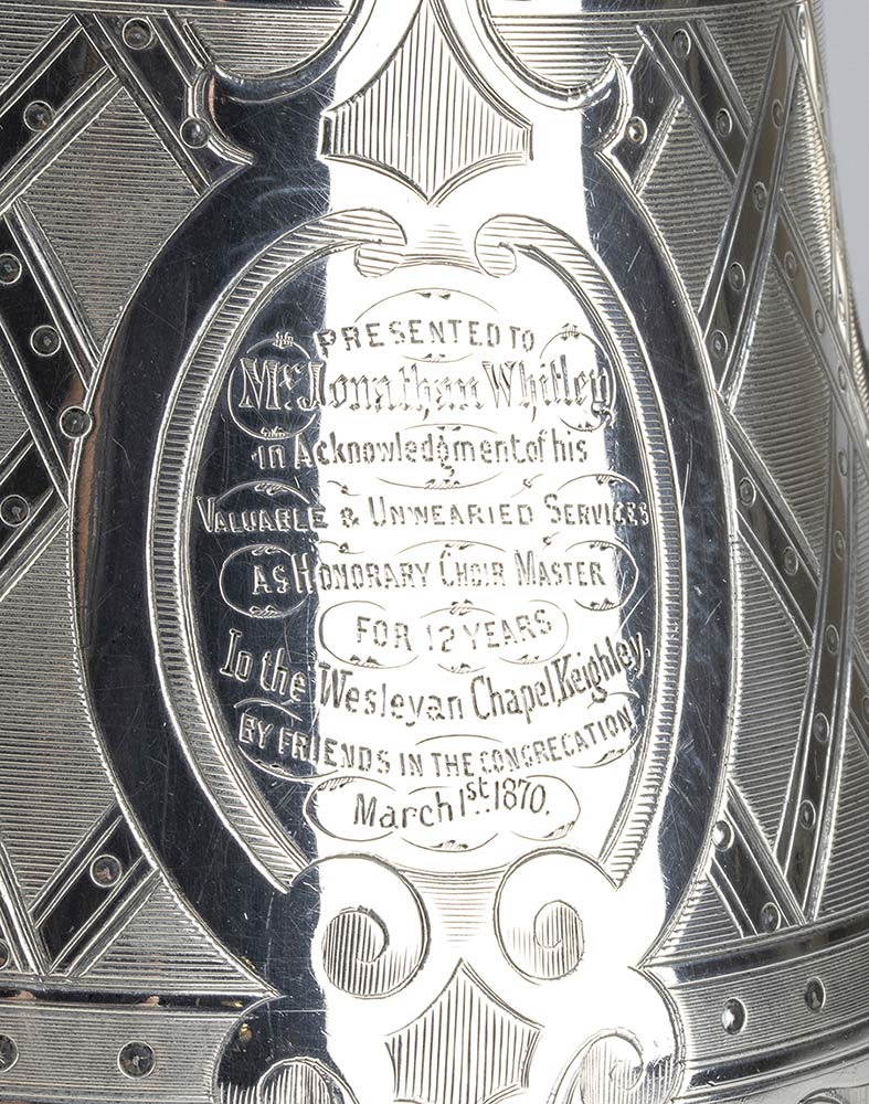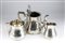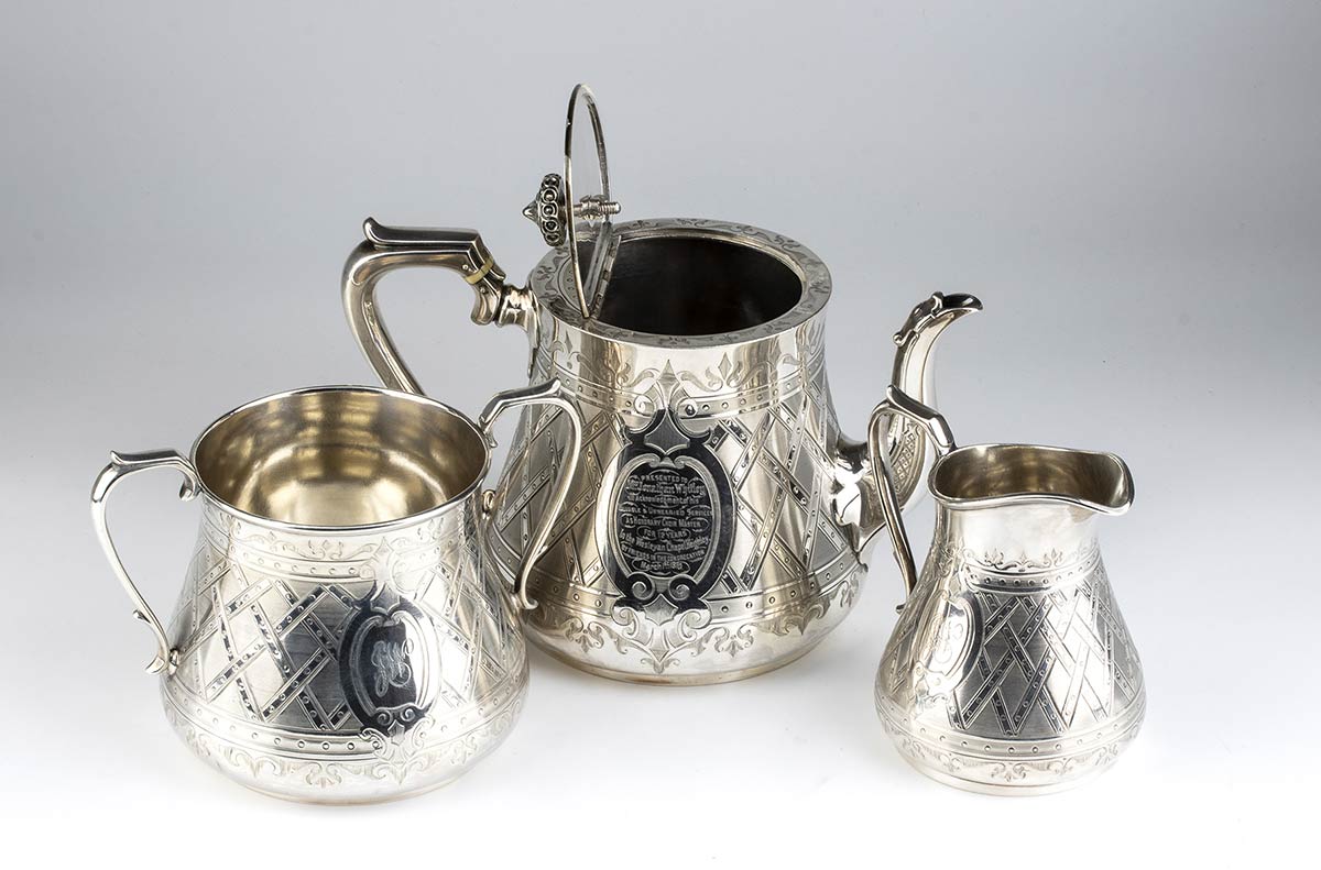 composto da un teiera, bricco da latte e zuccheriera poggianti su piede circolare decorati con motivi a graticcio. Argento 925/1000, serie completa di marchi Sheffield 1869-1870, argentieri William & Henry Stratford.