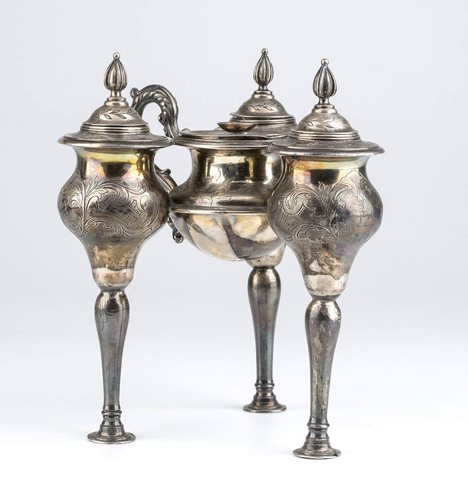 composto da tre contenitori laterali e uno centrale per lo stoppino, manico radiale. Argento 925/1000, serie completa di marchi Londra 1841-1842, maestro argentiere William Richards.