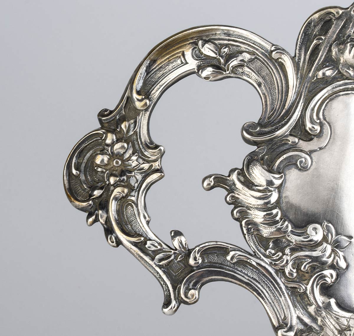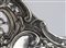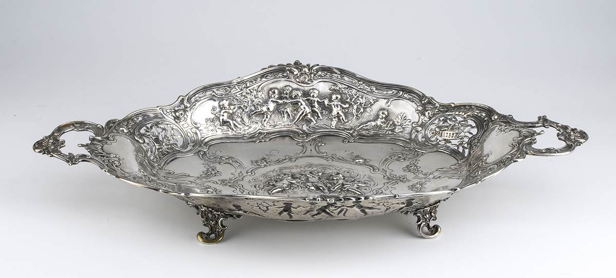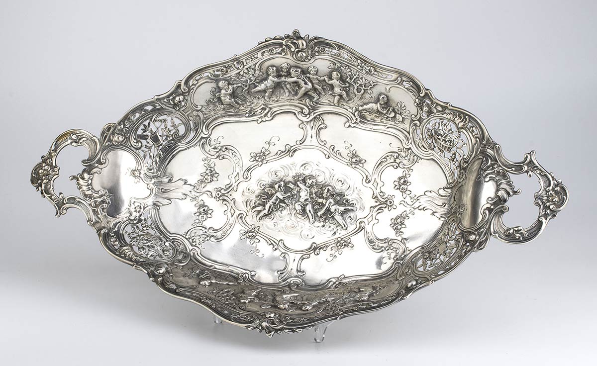 di forma ovale sagomata con manici laterali, interamente decorato con putti, fiori e volute floreali. Argento 800/1000, punzonato "800".
