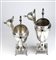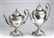 corpo ad urna poggiante su piede rettangolare poggiante su piedini a zoccolo. Manici ad ansa e coperchi incernierati con fastigio a pigna. Argenti 800/1000, punzonate con i marchi in uso in Germania dopo il 1888, e con i marchi dell'argentiere di Hanau J.D. Schleissner & Co.