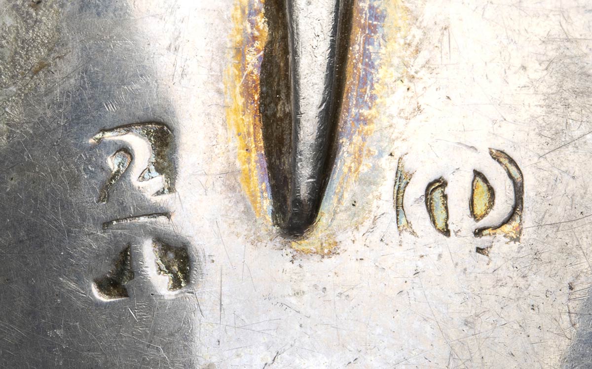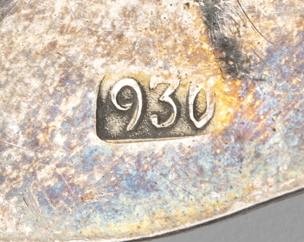 3) punzonato con i marchi olandesi del 1891 per l'argento al titolo di 934/1000 e con la serie competa di marchi di importazione a Chester nel 1891-1892, importatore I S Greenberg & Co (Israel Sigmund Greenberg), lunghezza 12 cm, peso 24 gr;