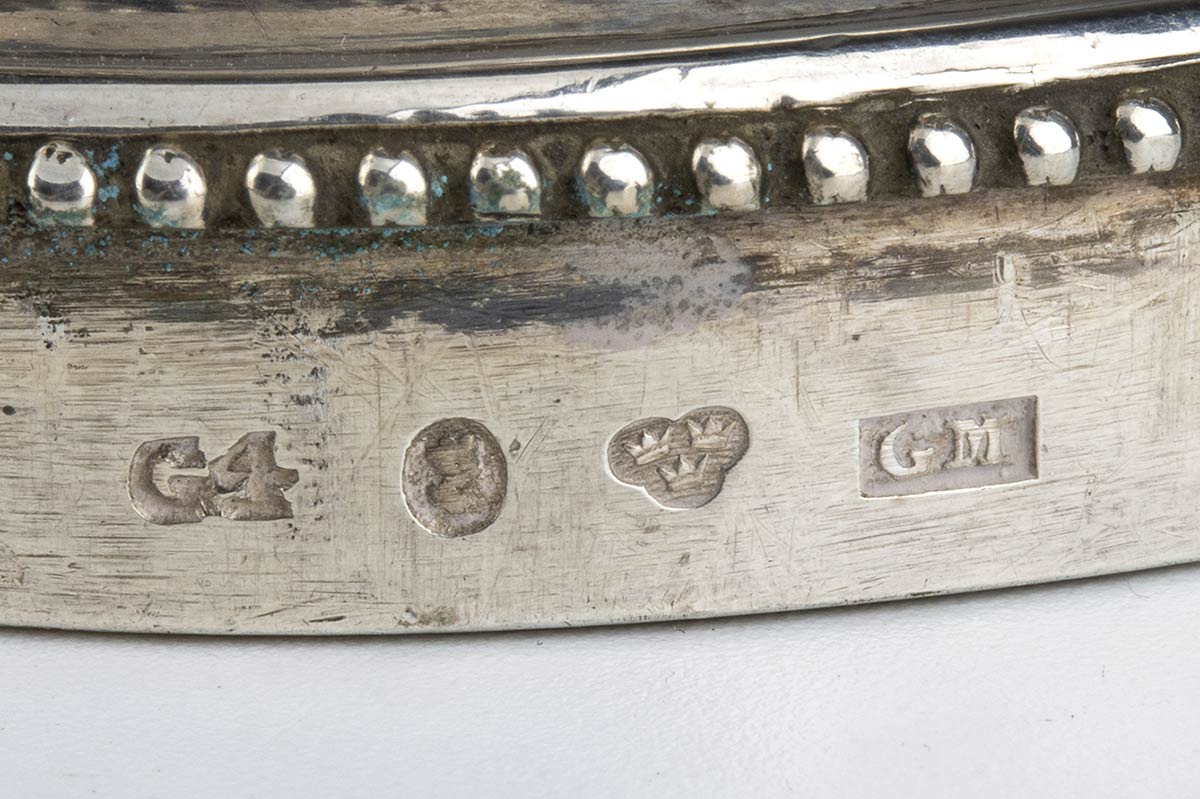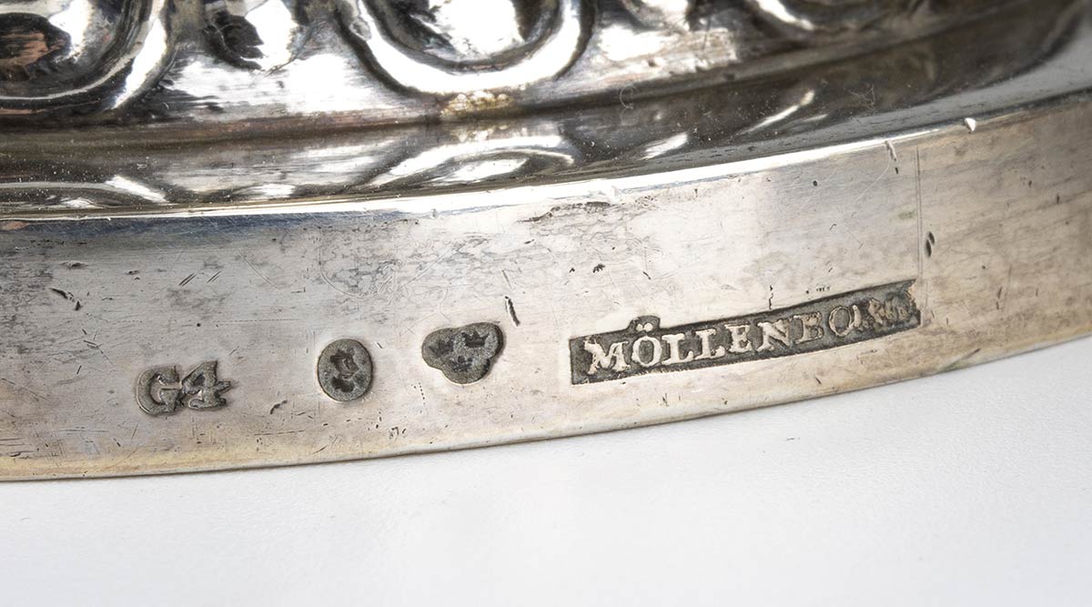 piede circolare decorato baccellato, corpo scanalato nella semiparte inferiore, orlo liscio con colletto baccellato, coperchio con chiusura ad innesto con fastigio floreale. Argento 830/1000, punzonata con i marchi in uso a Stoccolma nel 1837 (G4), argentiere Gustav Mollenberg.