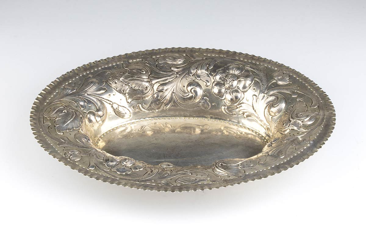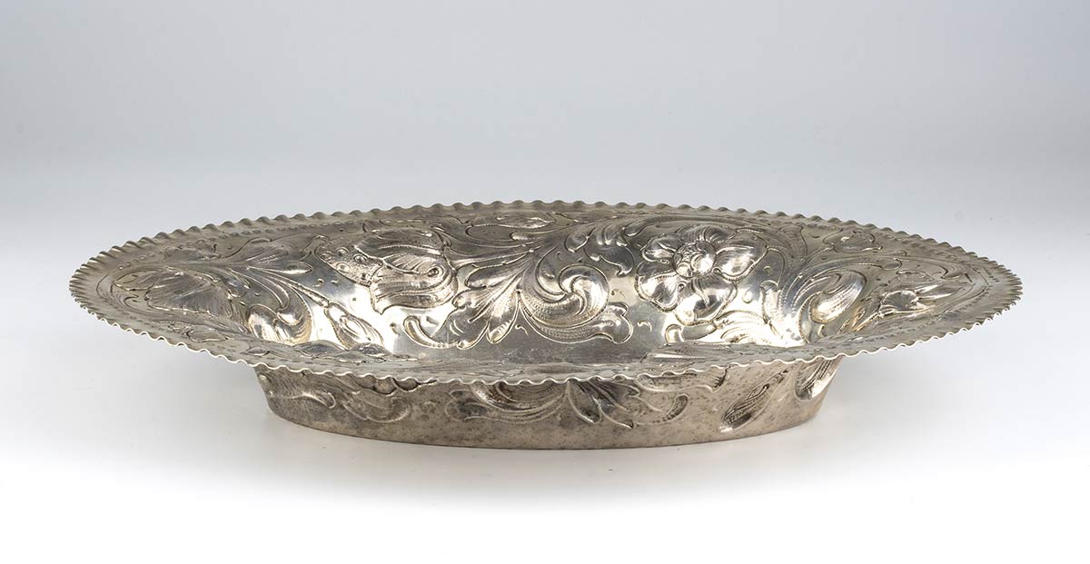 di forma ovale, interamente sbalzato e cesellato con fiori foglie. Argento 800/1000, punzonato con i marchi in uso a Stoccolma nel 1912 (K7), argentiere C.G. Hallberg (C.G. Hallbergs Guldsmeds AB), importante orafo e gioielliere della corte svedese.