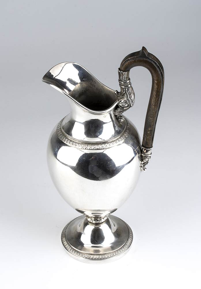 di linea neoclassica, base circolare e corpo liscio con decorazioni a palmette; manico ligno. Punzonato con i marchi in uso a Vienna all'inizio del XIX secolo per l'argento al titolo di 13 lothige (812/1000), argentiere "I.W.", Josef Wiederspeck, attivo dal 1822 al 1858 e con questo marchio dal 1822 al 1848 (Ref. Waltrud Neuwirth, Wiuener Silber 1781-1866, pag. 196).