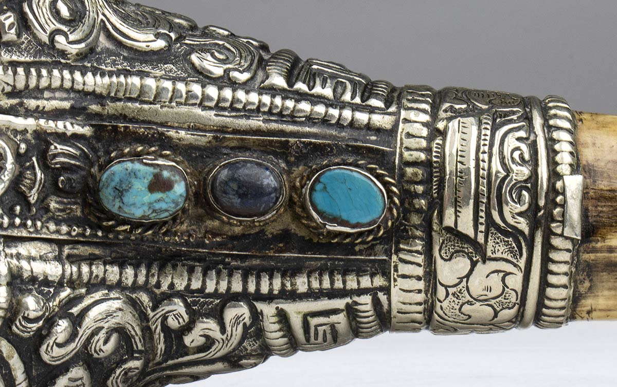 kangling tibetano, strumento a fiato originario del Nepal. Utilizzato principalmente durante i rituali buddisti, presenta elementi in argento sbalzato e cesellato con figure tipiche, incastonato con lapis e turchesi iraniani.
