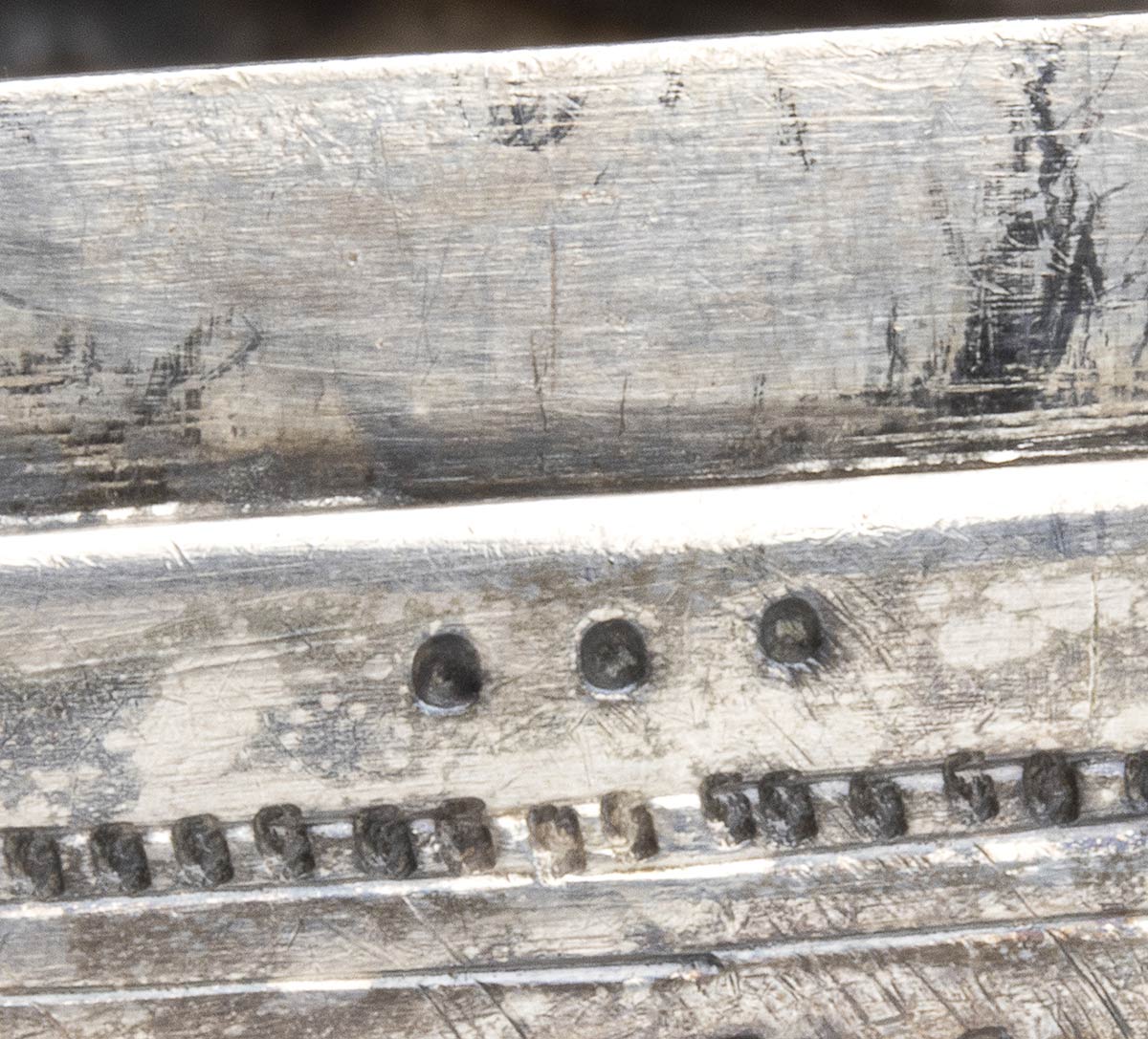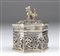 sbalzata e cesellata con motivi di foglie a volute, il coperchio con chiusura ad innesto è cimato da un cane stilizzato.