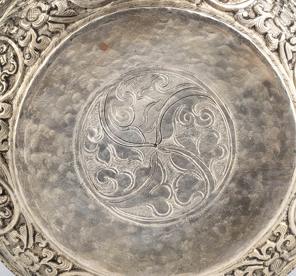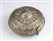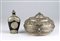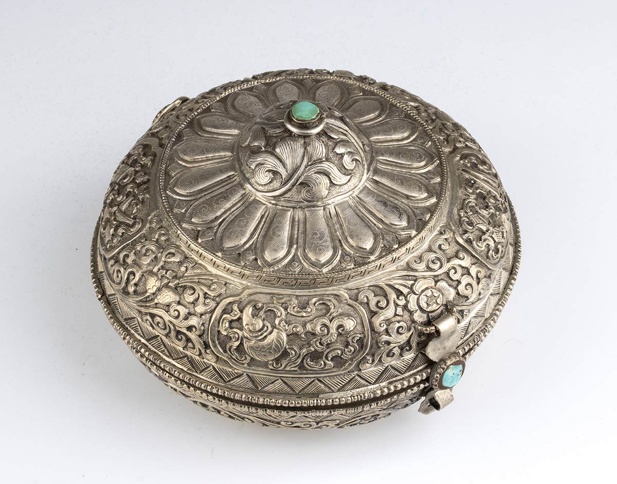 2) scrigno di forma rotonda in metallo, decorato con motivi floreali e geometrici e incastonato con pietre di turchese, coperchio incernierato. Altezza x diametro: 9 x 14,5 cm, peso 342 gr.