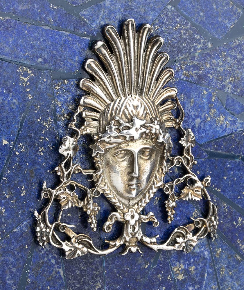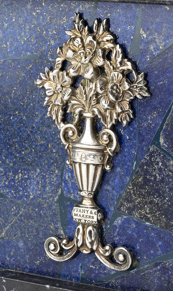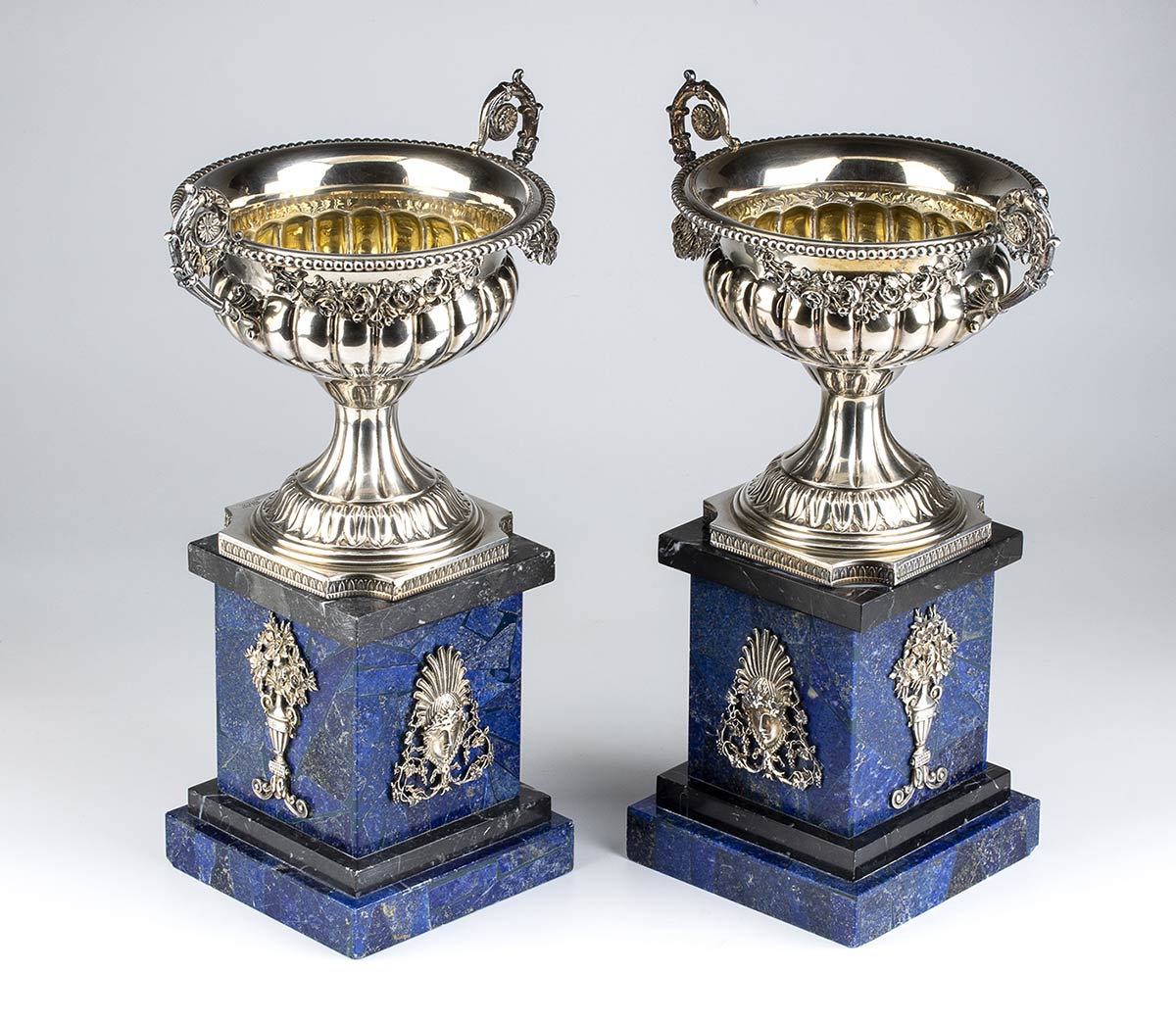 di forma craterica, biansate con base quadrata ad angoli convessi, poggianti su plinti quadrangolari in lapislazuli decorati sui lati con applicazioni raffiguranti teste femminili contornate da tralci d'uva e pampini. Argento 925/1000, punzonate "Tiffany & Co - Makers - New York".