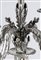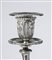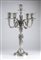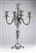 base di forma circolare sagomata decorata con foglie d'alloro, fusto decorato con fostoni; parte superiore a cinque fiamme con braccia a foglie d'acanto, piattini salva cera removibili. Argento 950/1000, punzonati con il marchio di esportazione francese "testa di mercurio" in uso a partire dal 1840, argentiere Tetard Frères con bottega in 4 rue Bélanger Parigi a partire dal 1903.
