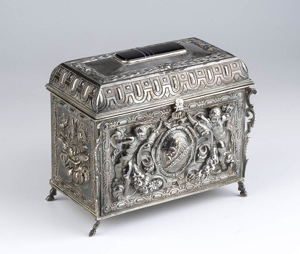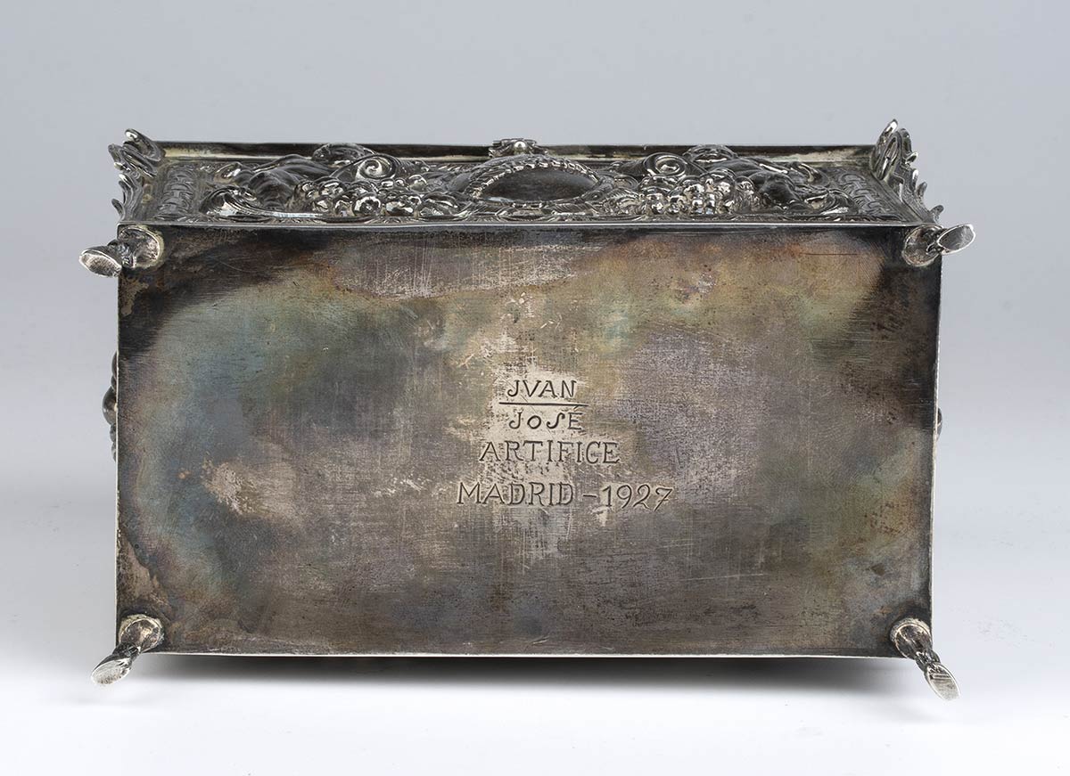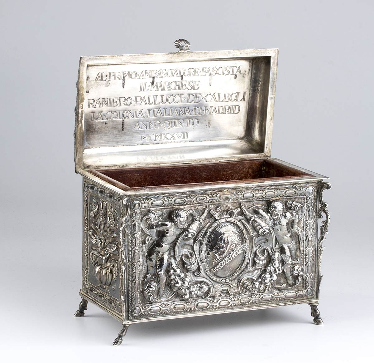 di forma rettangolare poggiante su piedi equini, i lati maggiori decorati rispettivamente con il profilo di Miguel de Cervantes (noto per essere l'autore del romanzo Don Chisciotte della Mancia) affiancato da putti con cornucopia e con uno stemma nobiliare sempre affiancato da putti, i lati minori a decori floreali. Coperchio incernierato cimato da un agata bandata al cui interno è presente la seguente iscrizione: "AL PRIMO AMBASCIATORE FASCISTA - IL MARCHESE - RANIERO PAOLUCCI DE CALBOLI - LA COLONIA ITALIANA DE MADRID - ANNO QUINTO - MCMXXVII". La parte sottostante firmata "JUAN JOSE - ARTEFICE - MADRID - 1927".