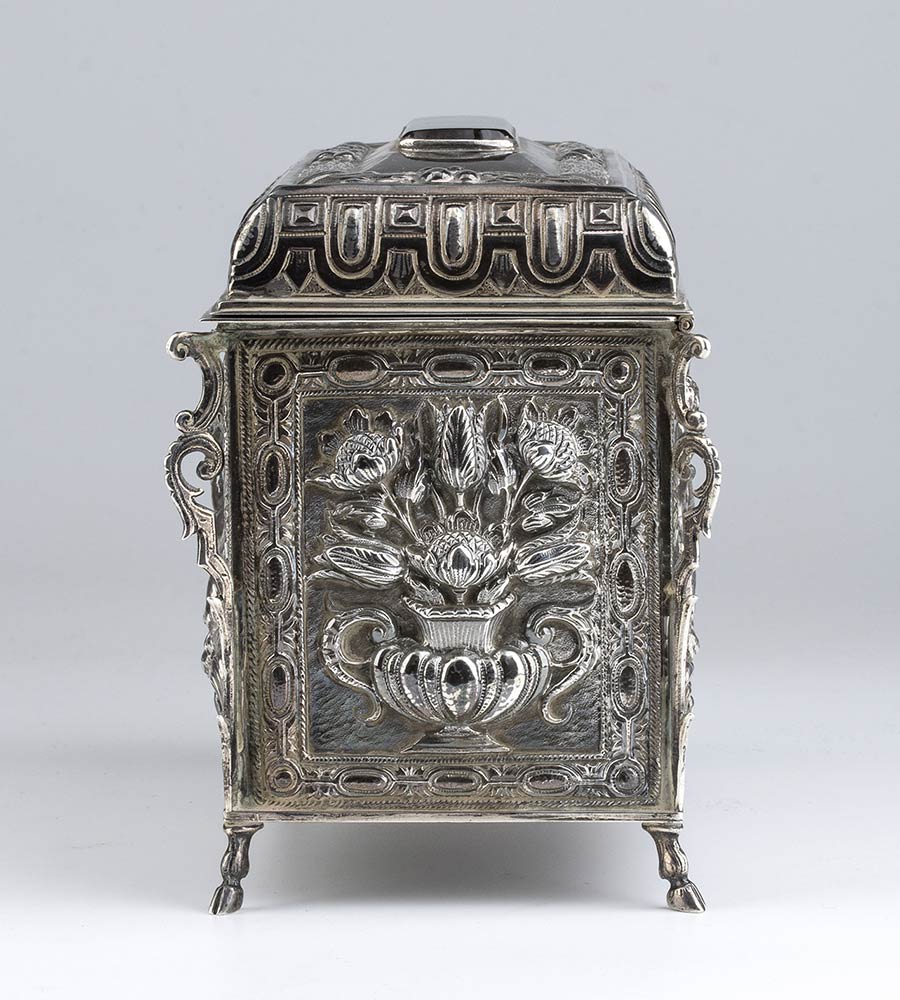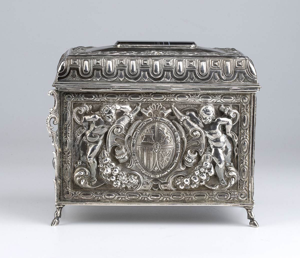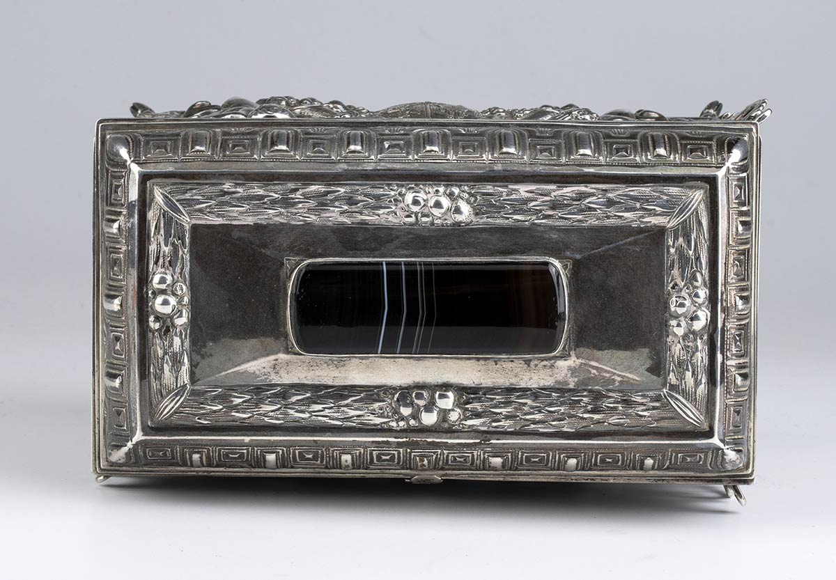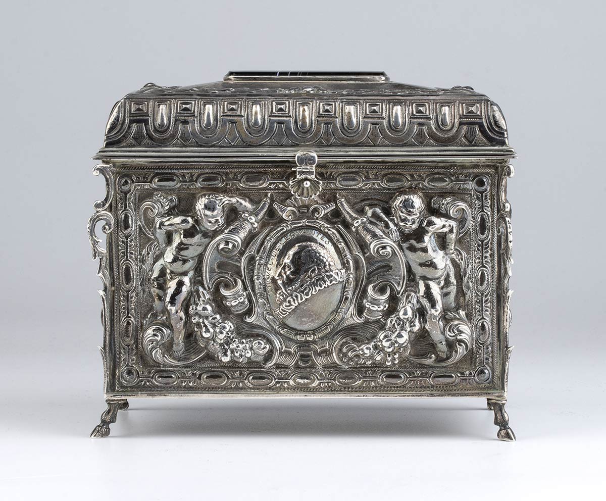 di forma rettangolare poggiante su piedi equini, i lati maggiori decorati rispettivamente con il profilo di Miguel de Cervantes (noto per essere l'autore del romanzo Don Chisciotte della Mancia) affiancato da putti con cornucopia e con uno stemma nobiliare sempre affiancato da putti, i lati minori a decori floreali. Coperchio incernierato cimato da un agata bandata al cui interno è presente la seguente iscrizione: "AL PRIMO AMBASCIATORE FASCISTA - IL MARCHESE - RANIERO PAOLUCCI DE CALBOLI - LA COLONIA ITALIANA DE MADRID - ANNO QUINTO - MCMXXVII". La parte sottostante firmata "JUAN JOSE - ARTEFICE - MADRID - 1927".