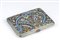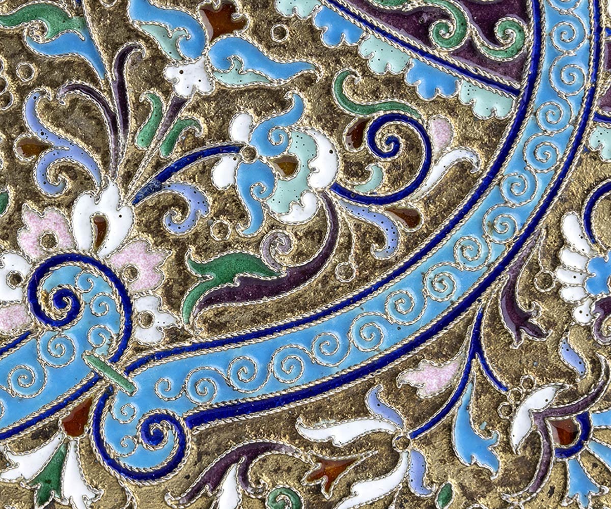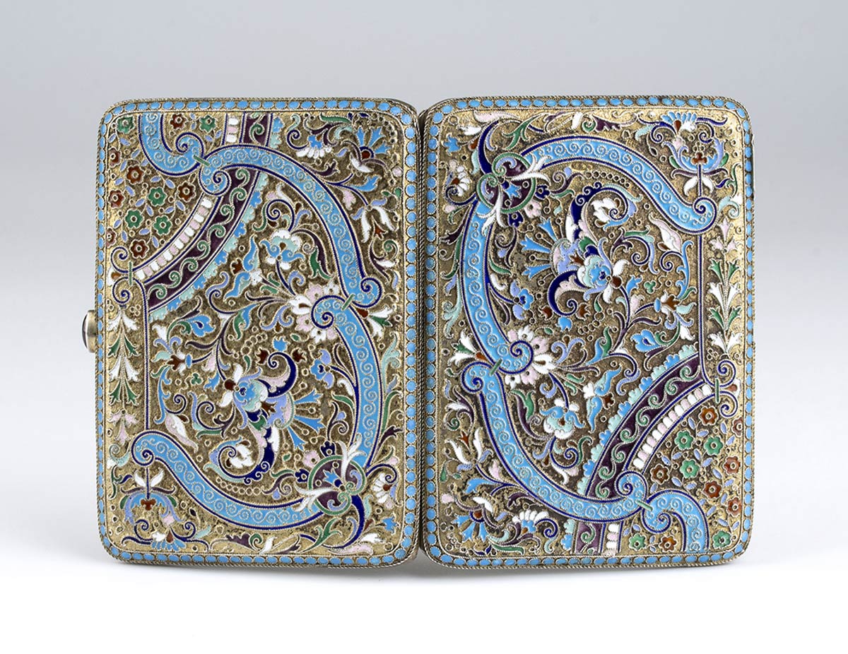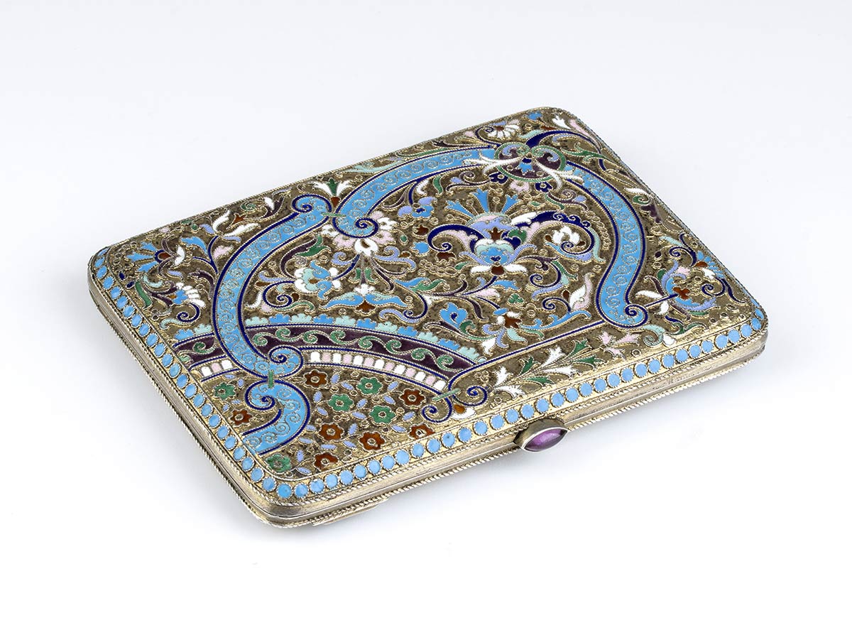 di forma rettangolare, riccamente decorato a motivi floreali con smalti policromi cloisonné, coperchio incernierato. Argento 875/1000, serie completa di marchi per l'argento al titolo di 84 zolotniks in uso a Mosca dal 1908 al 1927.
