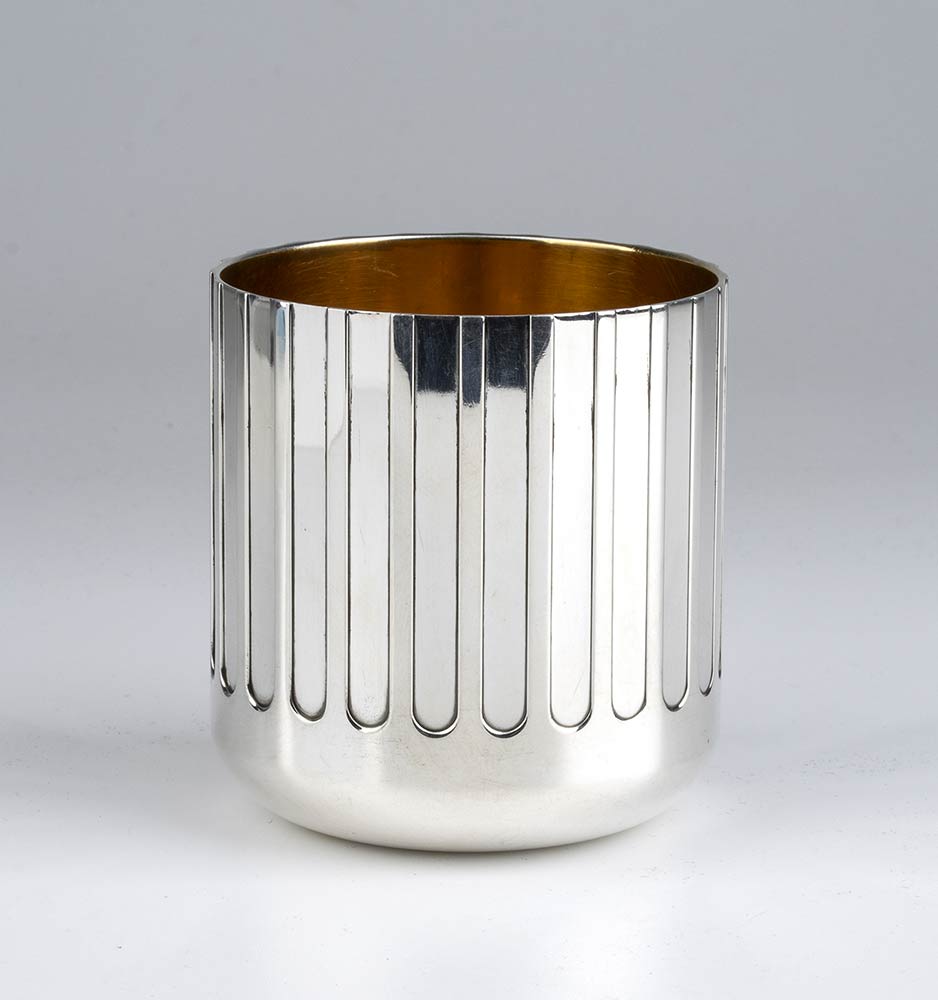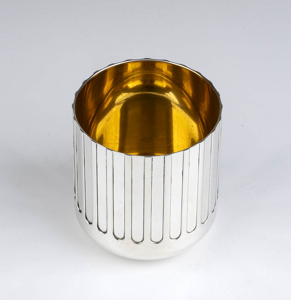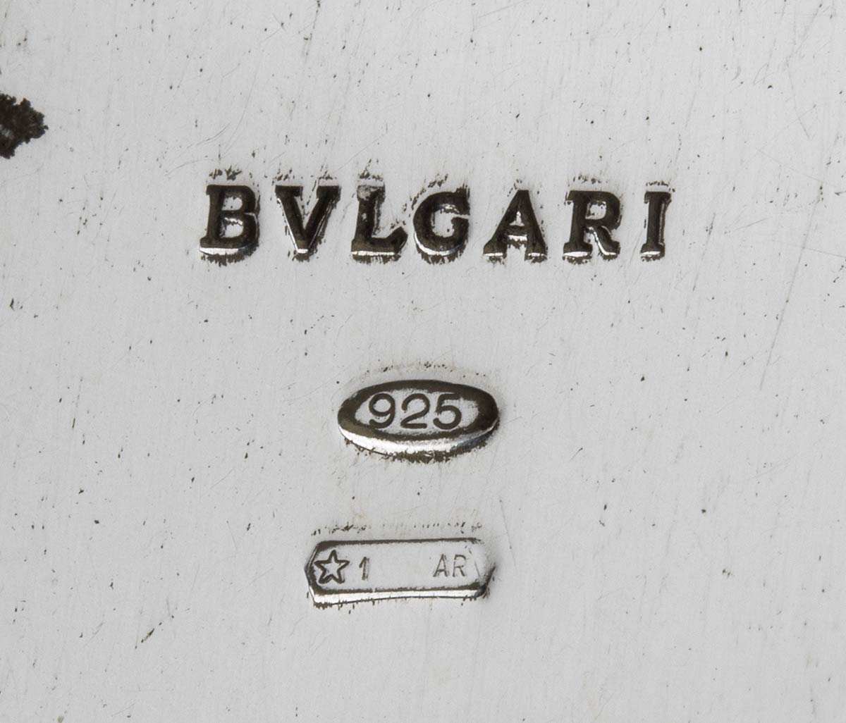 di forma rotonda con scanalature verticali e interno dorato. Argento 925/1000. Punzonato "BVLGARI - 925 - * 1 AR ".