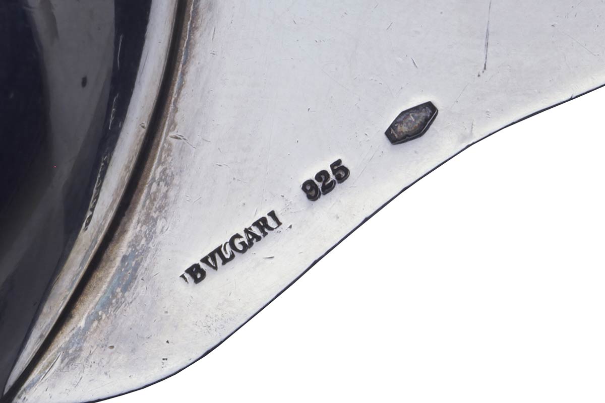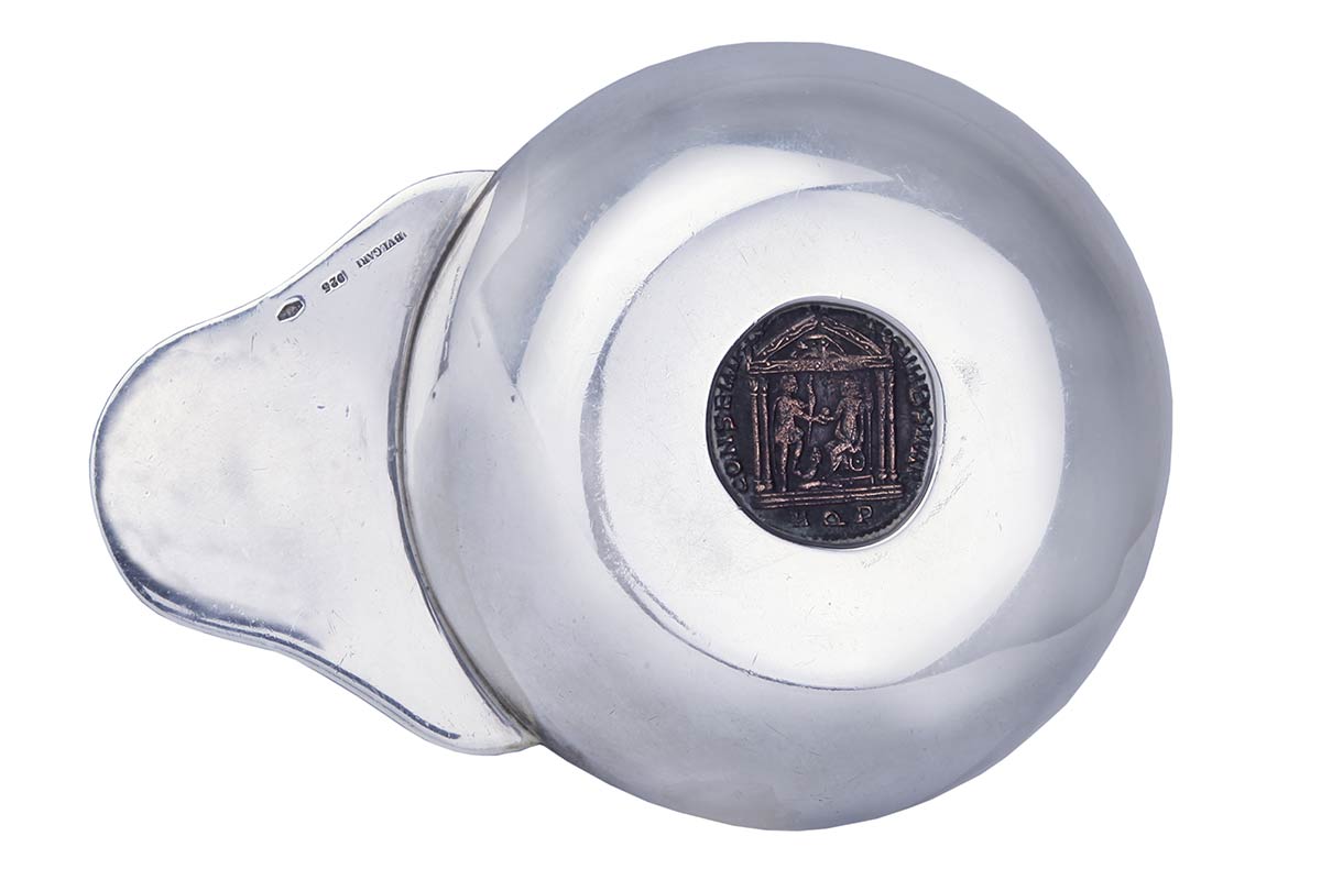 di forma circolare con presa laterale, il fondo incastonato con la seguente moneta: Massenzio (306-312 d.C.) - Follis databile al 307 d.C. Aquileia. Obv/ IMP C MAXENTIVS P F AVG, testa laureata di Massenzio a destra. R/CONSERV VRB SVAE. La dea Roma seduta a sinistra porge un globo a Massenzio che gli sta di fronte; il tutto all'interno di un tempio tetrastilo. Argento 925/1000, punzonato "925 - BVLGARI - ... Roma".