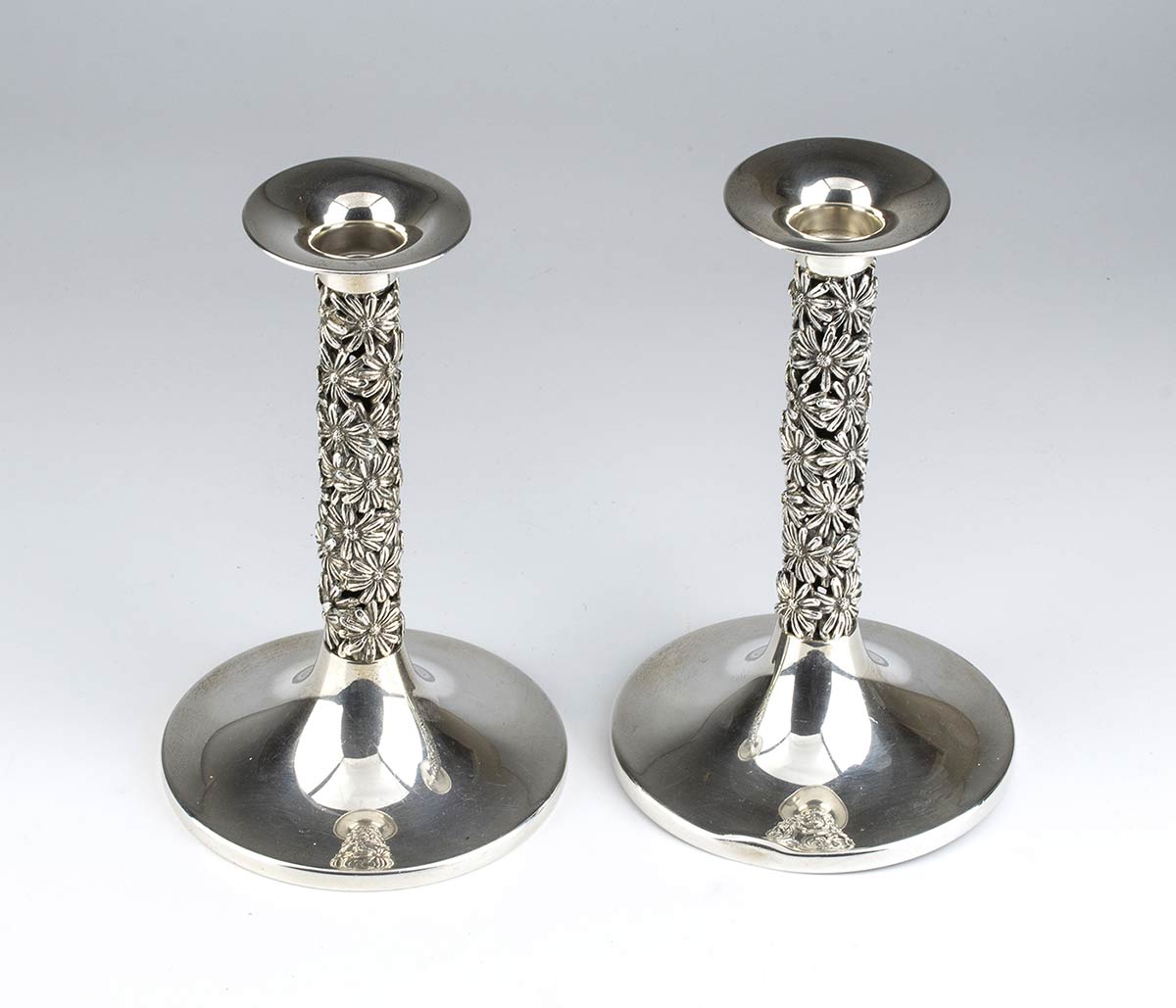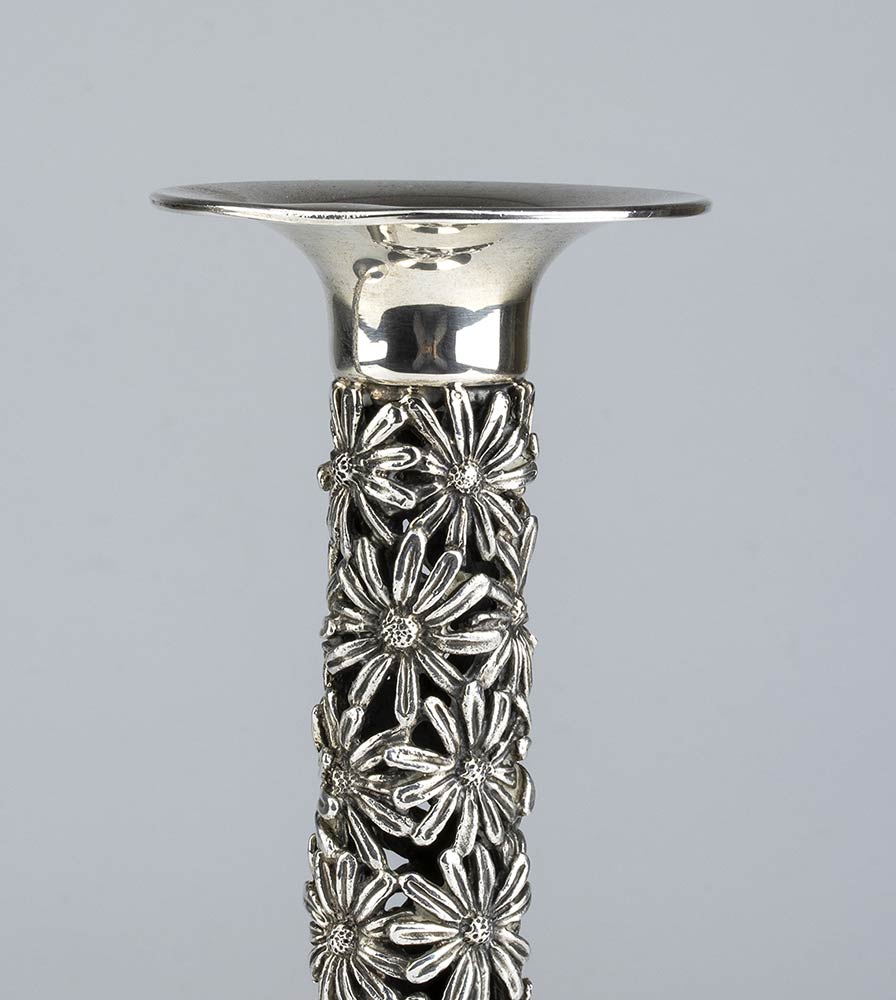 base circolare liscia e fusto interamente decorato con margherite. Argento 925/1000, punzonati "900" e "* 132 AR" e firmati G. Raspini.