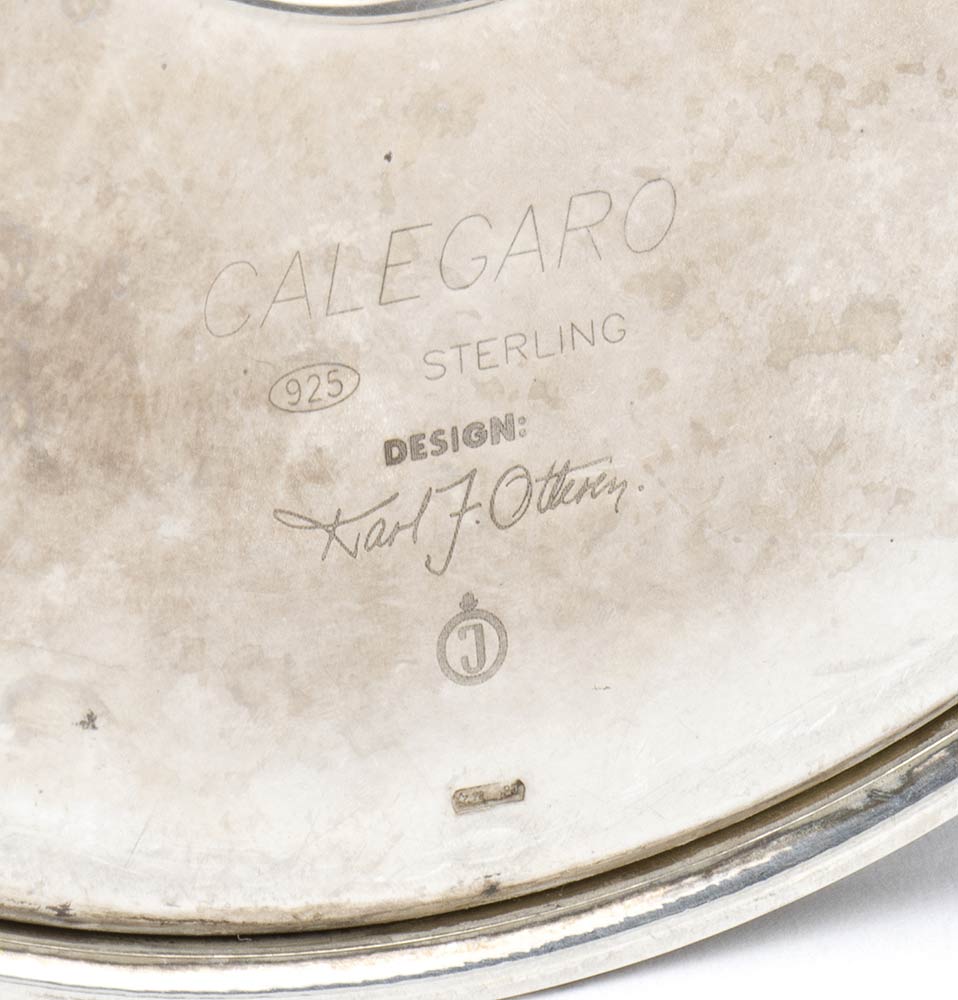 base circolare con fusto liscio. Argento 925/1000, punzonati "* 78 PD" e firmati "CALEGARO - 925 - STERLING - Design K. J. Otteren".