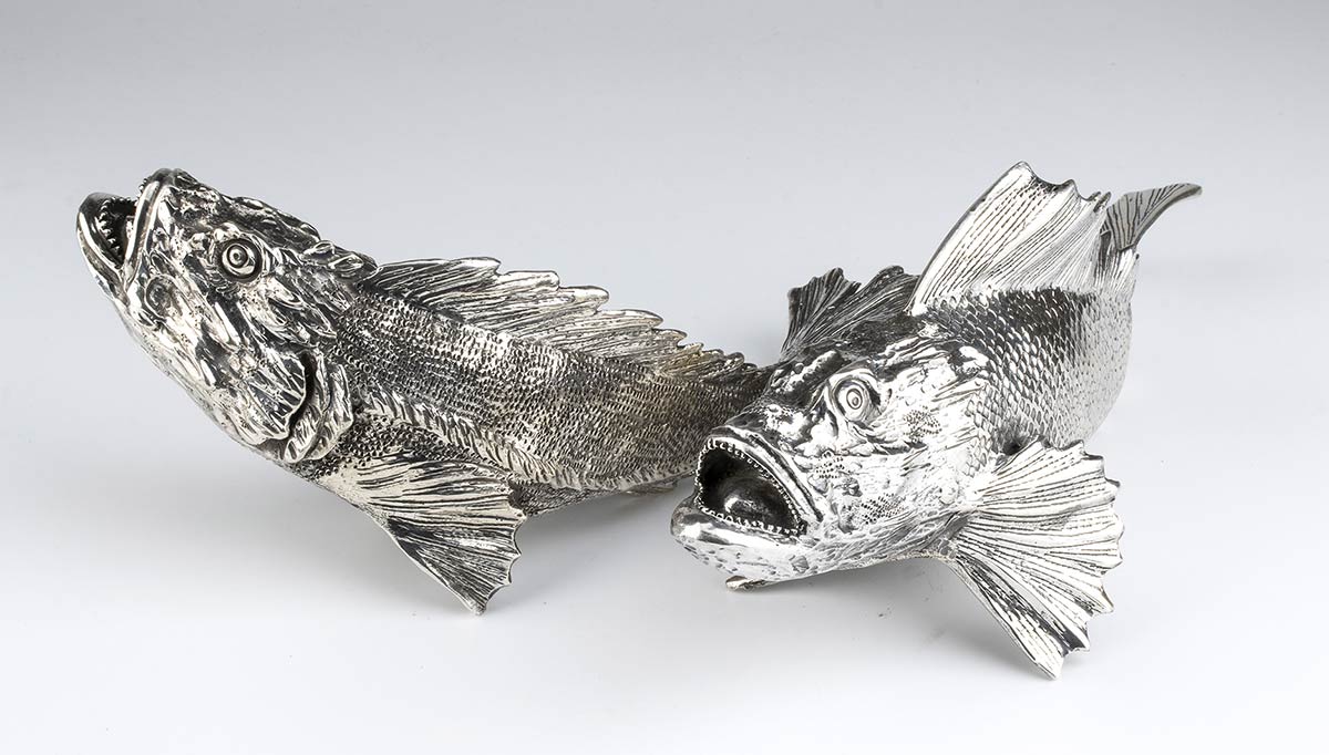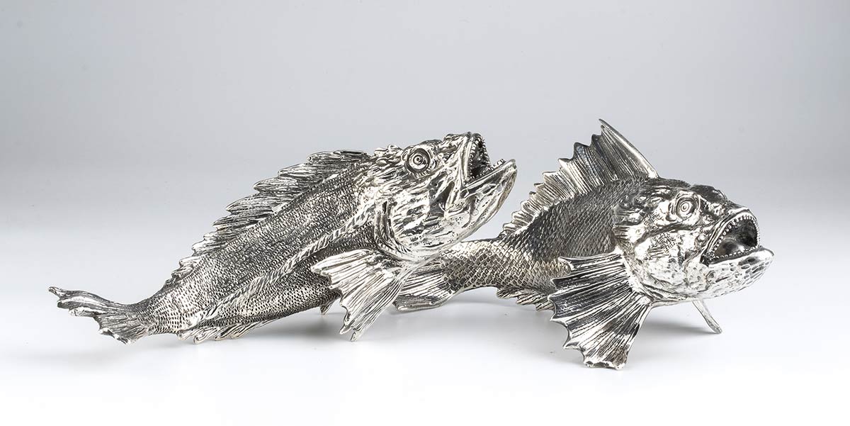 Coppia di sculture in argento raffiguranti pesci, firmate ATTILIO DE LUCA