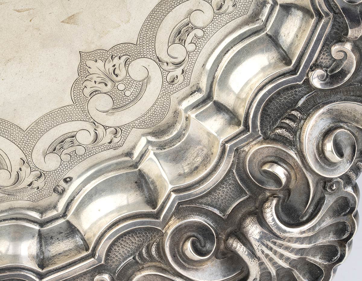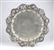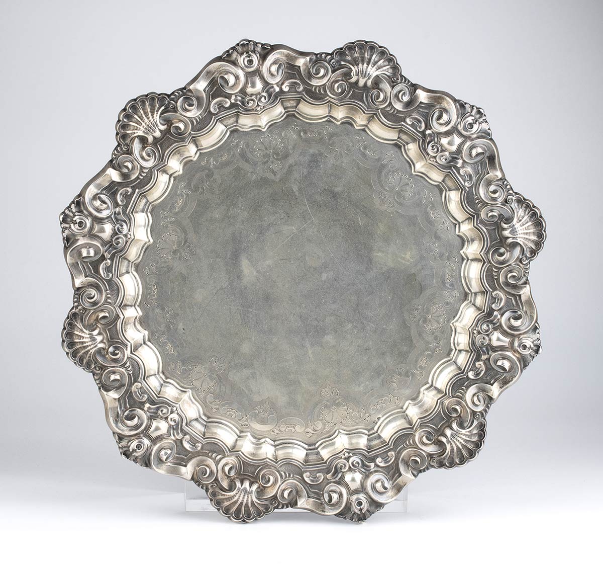 di forma circolare, la tesa riccamente decorata con nastri e conchiglie. Argento 833/1000, punzonato con i marchi in uso ad Oporto, Portogallo, dopo il 1938.