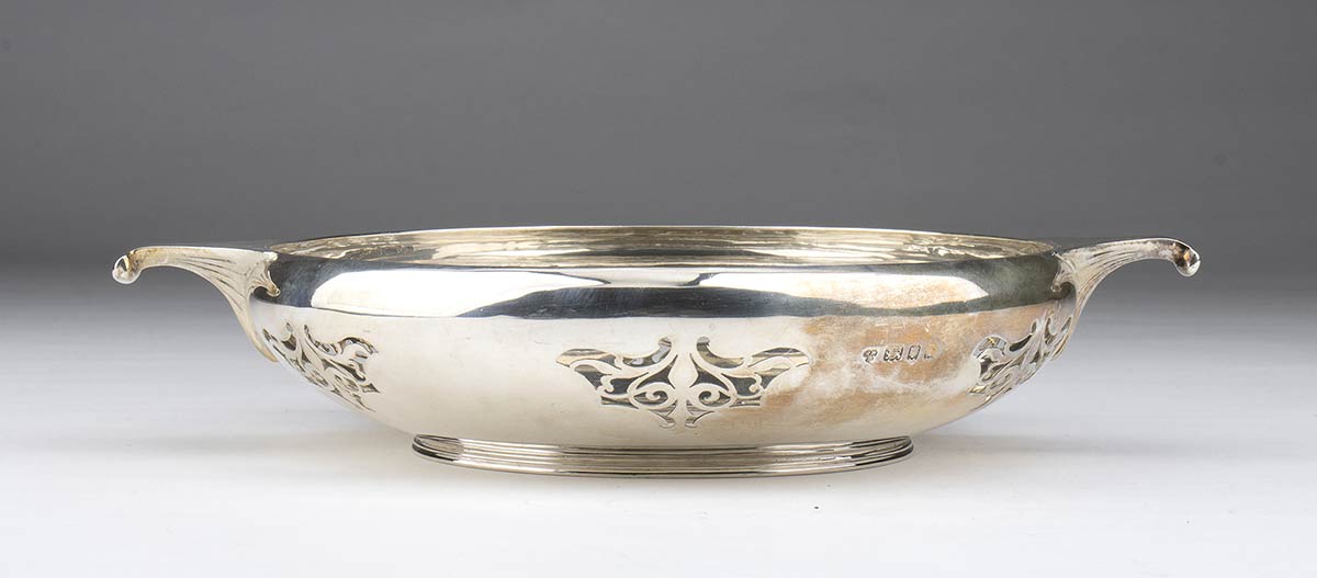 di forma circolare, traforata con manici laterali. Argento 925/1000, serie completa di marchi Londra 1934-1935, argentiere Harrods Ltd.