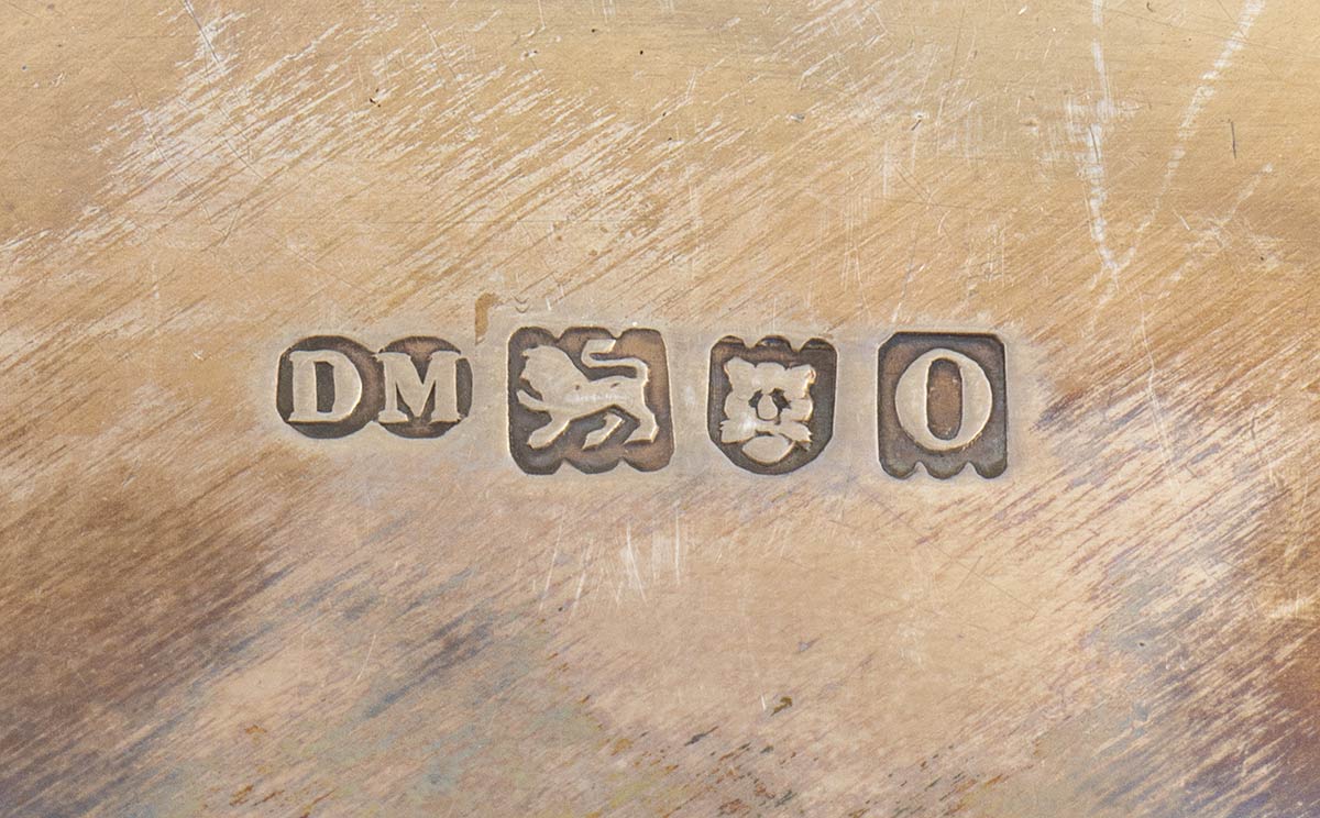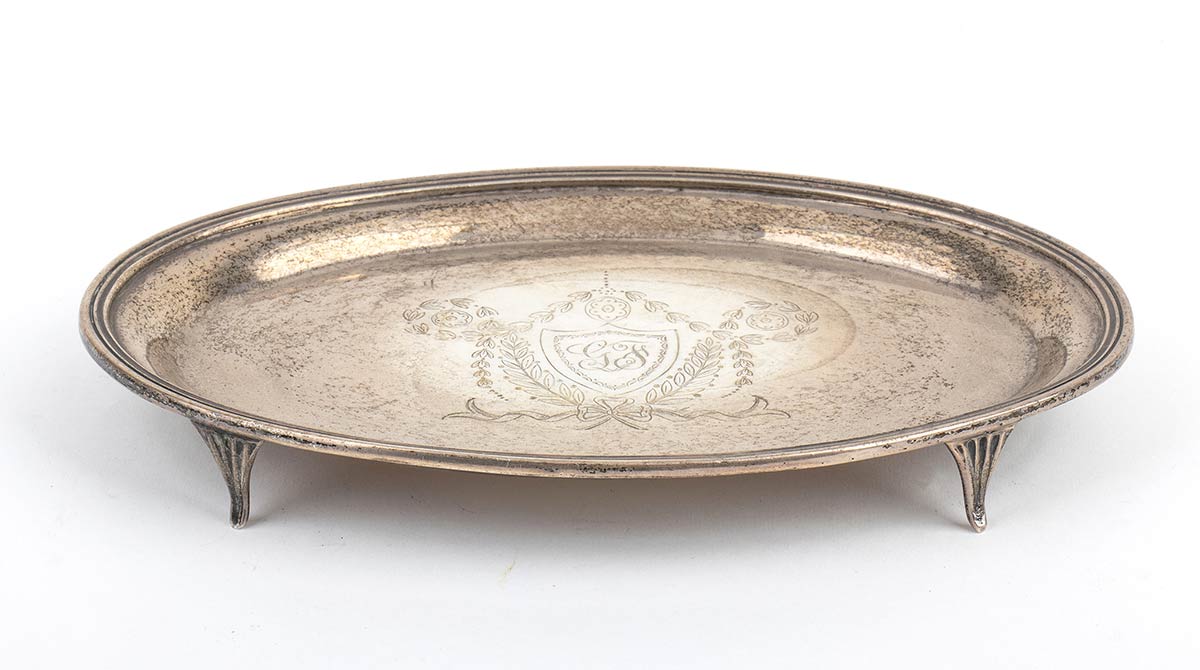 di forma ovale, a quattro piedini; al centro un monogramma inciso. Argento 925/1000, serie completa di marchi Londra 1909-1910, argentiere David Munsey, Munsey & Co. ltd.