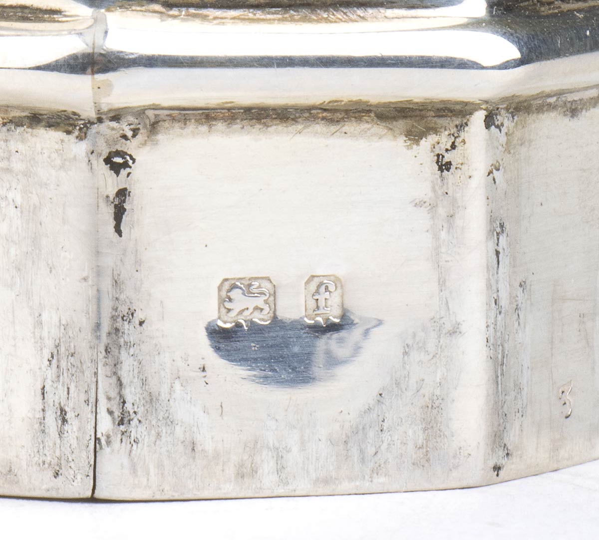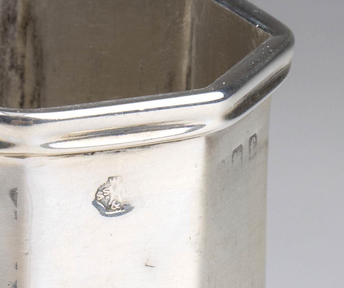 di forma ottagonale. Argento 925/1000, serie completa di marchi Birmingham 1905-1906, argentiere William Hutton & Sons Ltd.