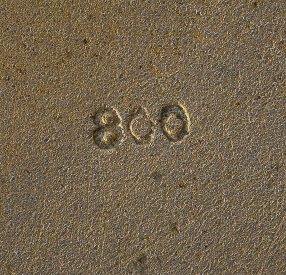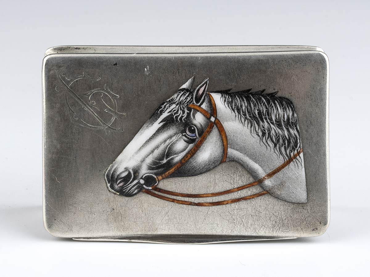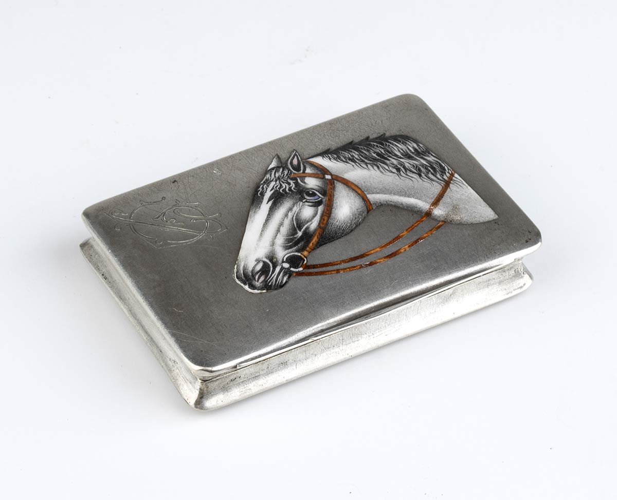 di forma rettangolare, il fronte smaltato con una testa di un cavallo. Argento 800/1000, punzonata "800".
