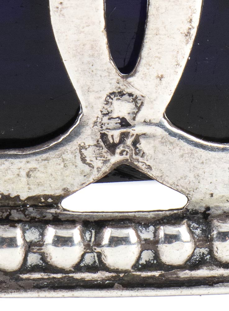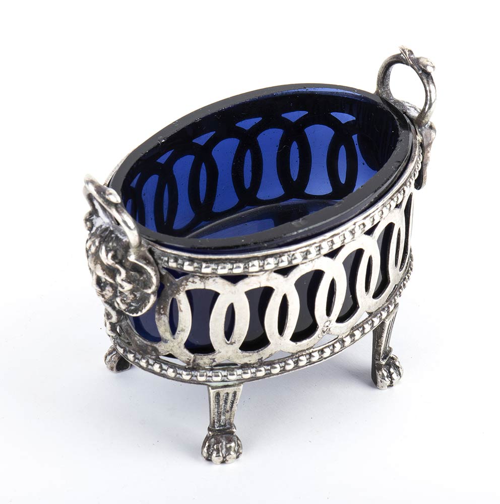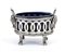 di forma ovale poggiante su quattro piedi ad artiglio, manici laterali con testa di medusa, bordo traforato e contenitore in vetro blu. Punzonata con il marchio camerale in uso nello Stato Pontificio per gli oggetti in argento, rappresentato dalle "chiavi incrociate di San Pietro sotto l'ombrello liturgico".