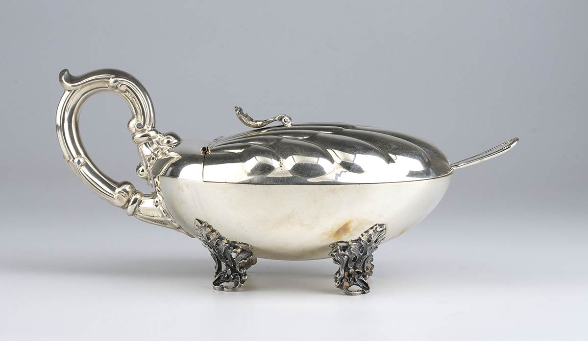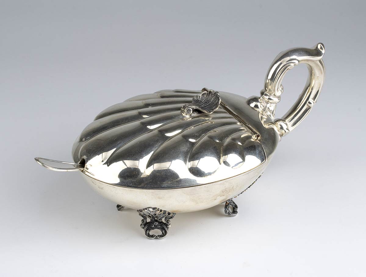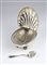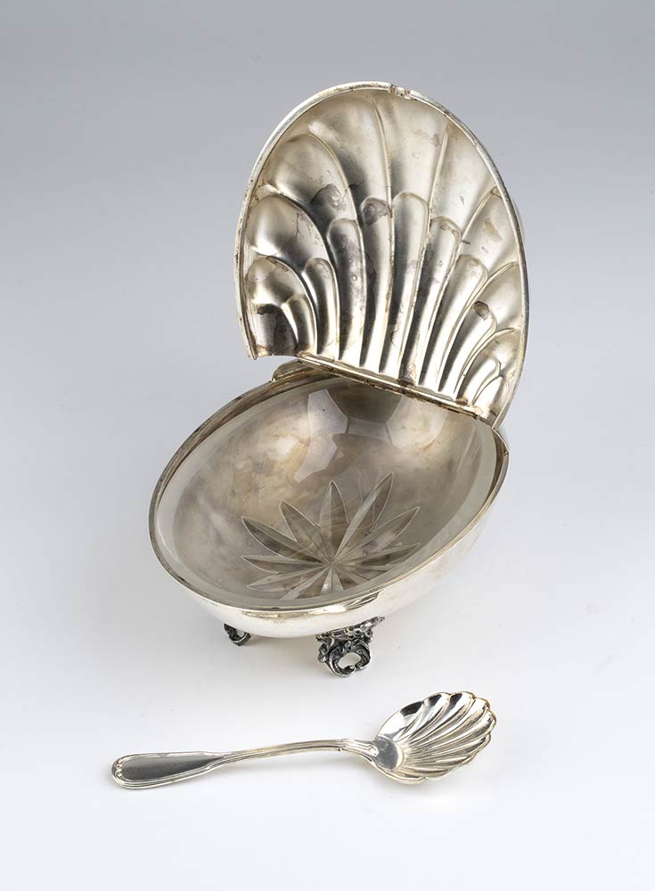 a forma di conchiglia con manico a voluta, contenitore in vetro. Argento 800/1000, punzonata "800" e "1 AL", argentiere CESA.