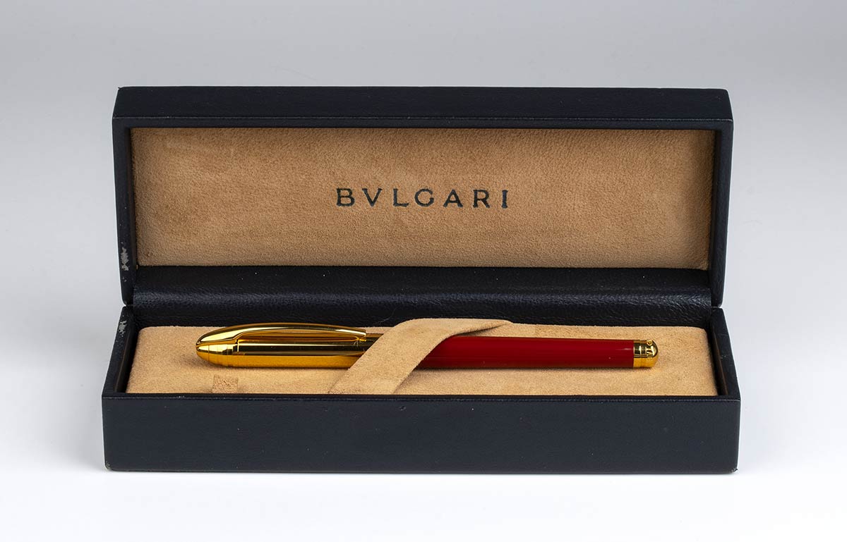 fusto in lacca rossa e cappuccio in metallo dorato.