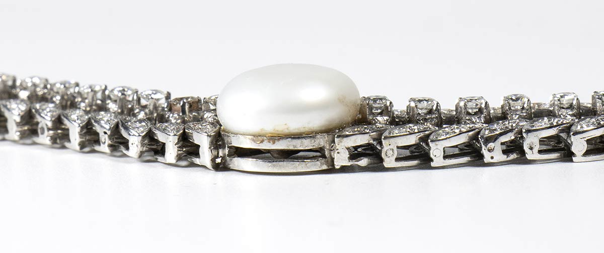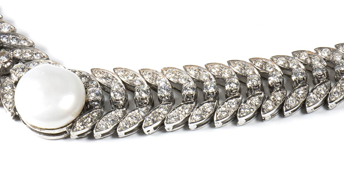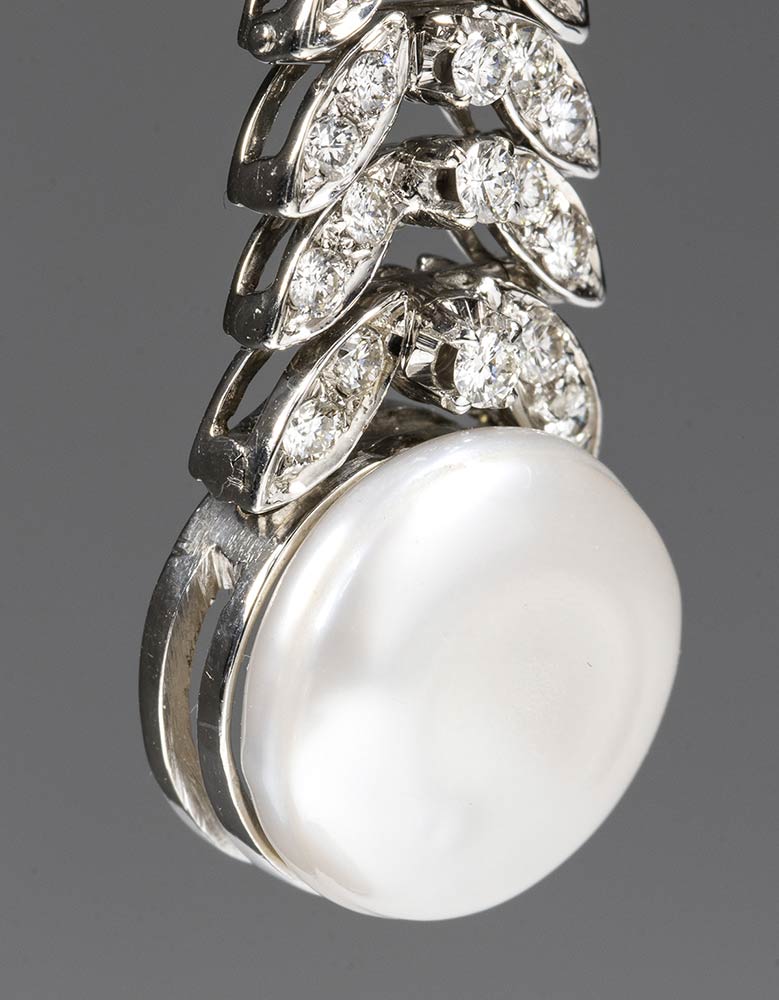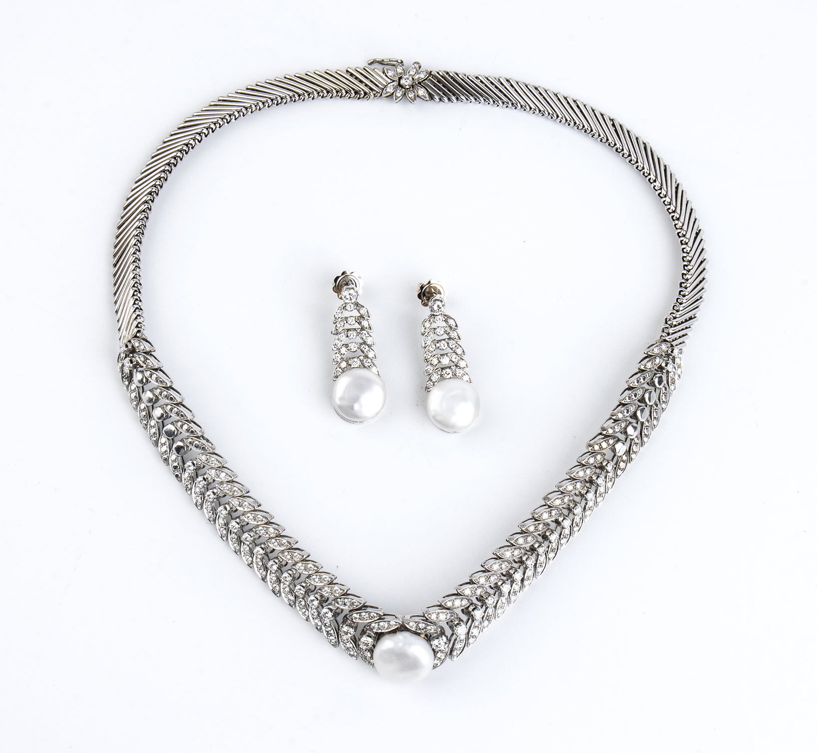oro bianco 18k, girocollo con motivo di foglioline in diamanti e perla coltivata d'acqua dolce centrale; un paio di orecchini di fattura simile.