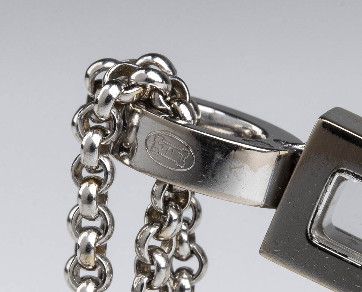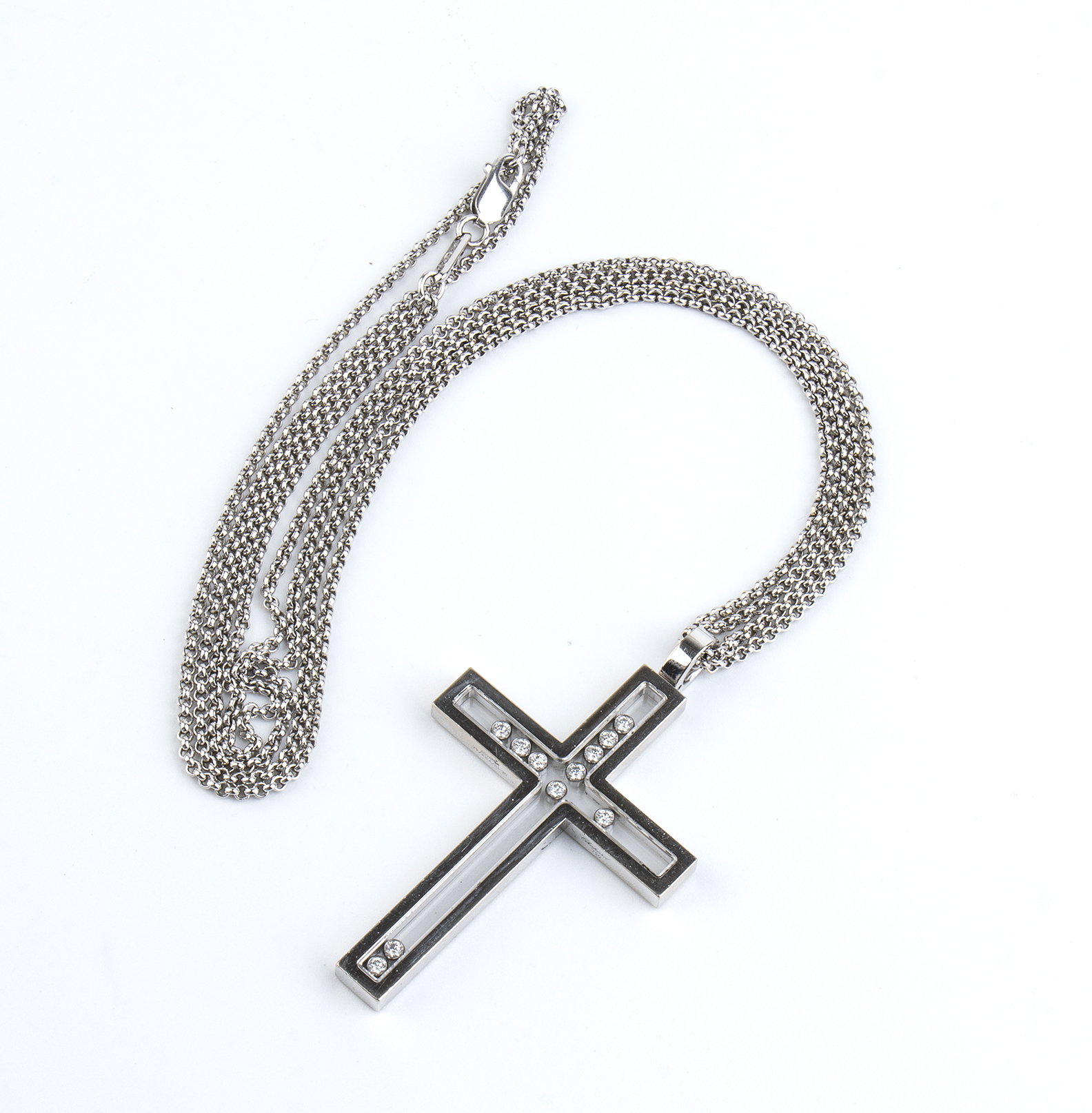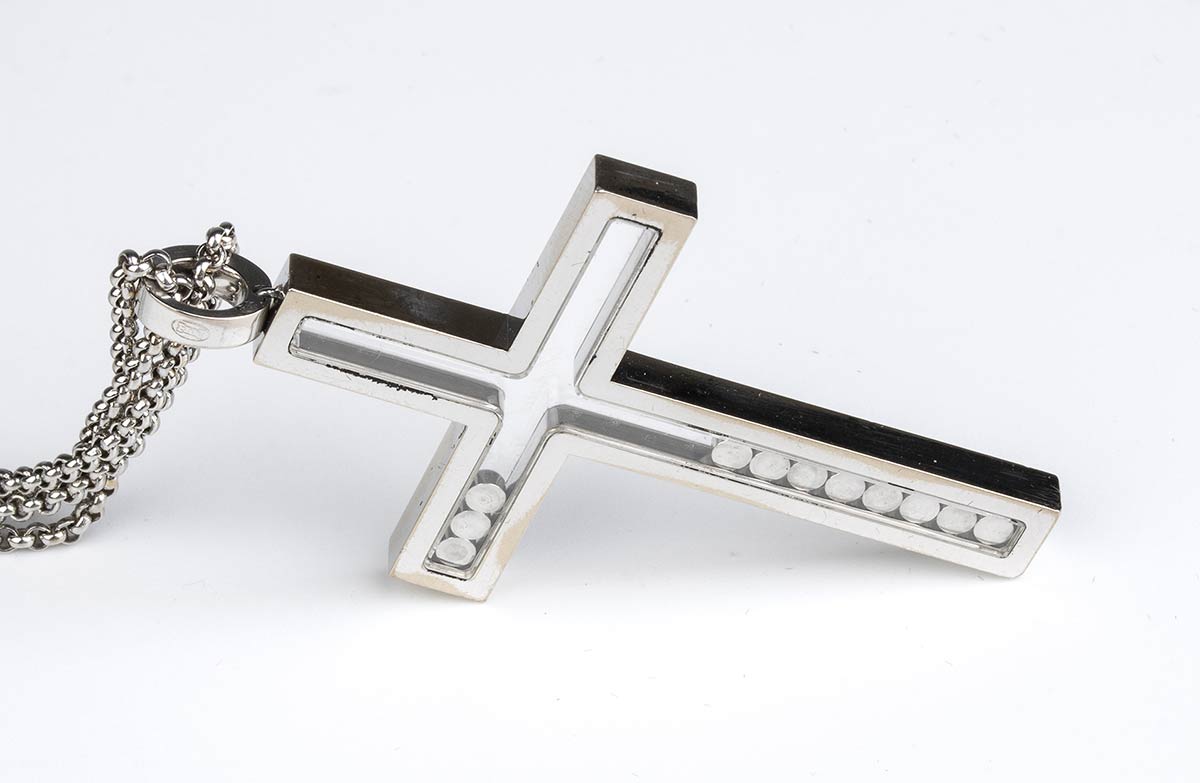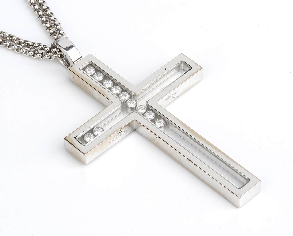 oro bianco 18k, con doppia catena a maglia rolò a cui è sospeso un pendente a forma di croce modello "Happy Diamond".