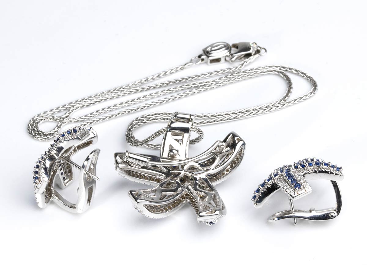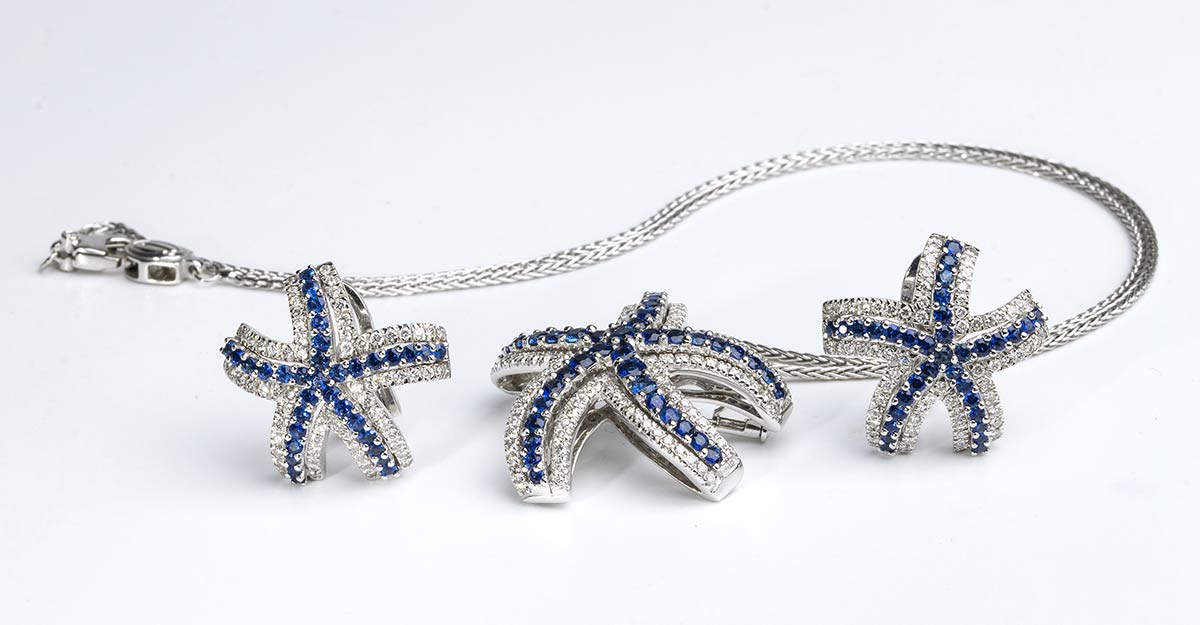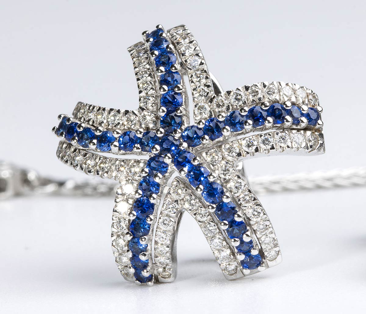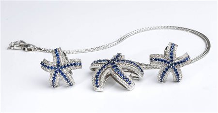 oro bianco 18k, pendente ed orecchini raffiguranti una stella marina incastonati con zaffiri e diamanti. Firmato DAMIANI.