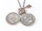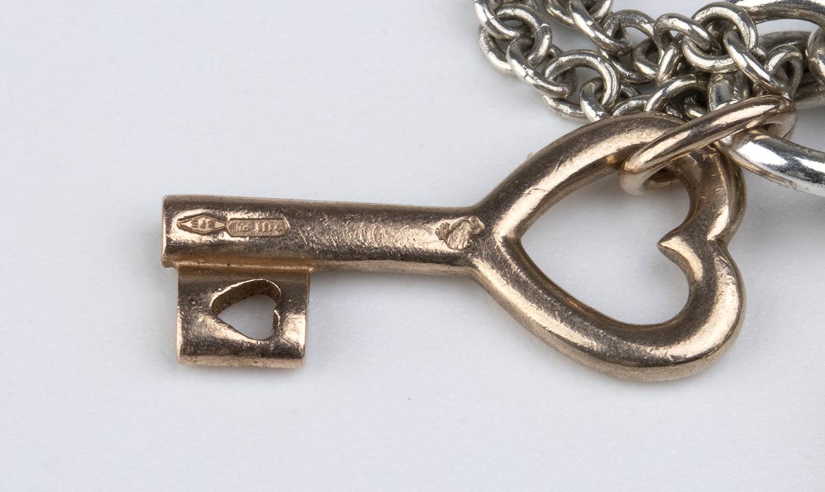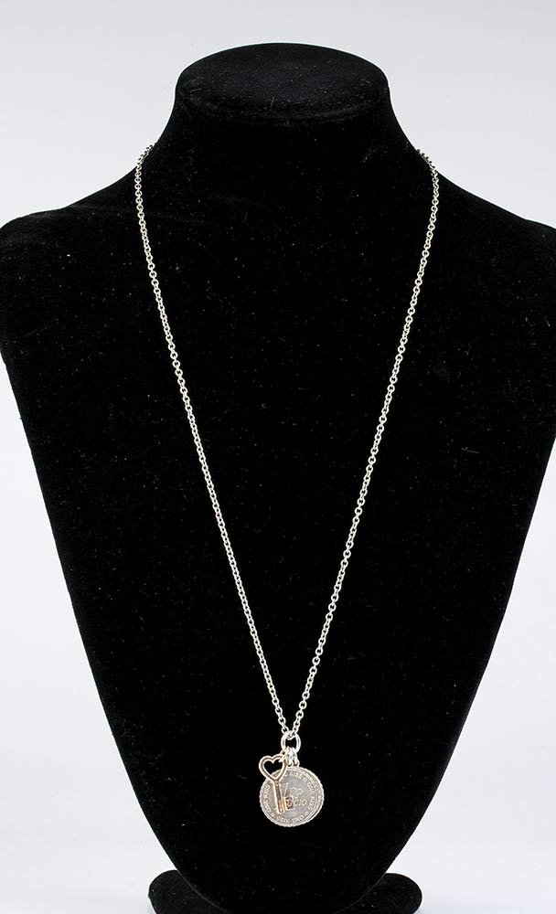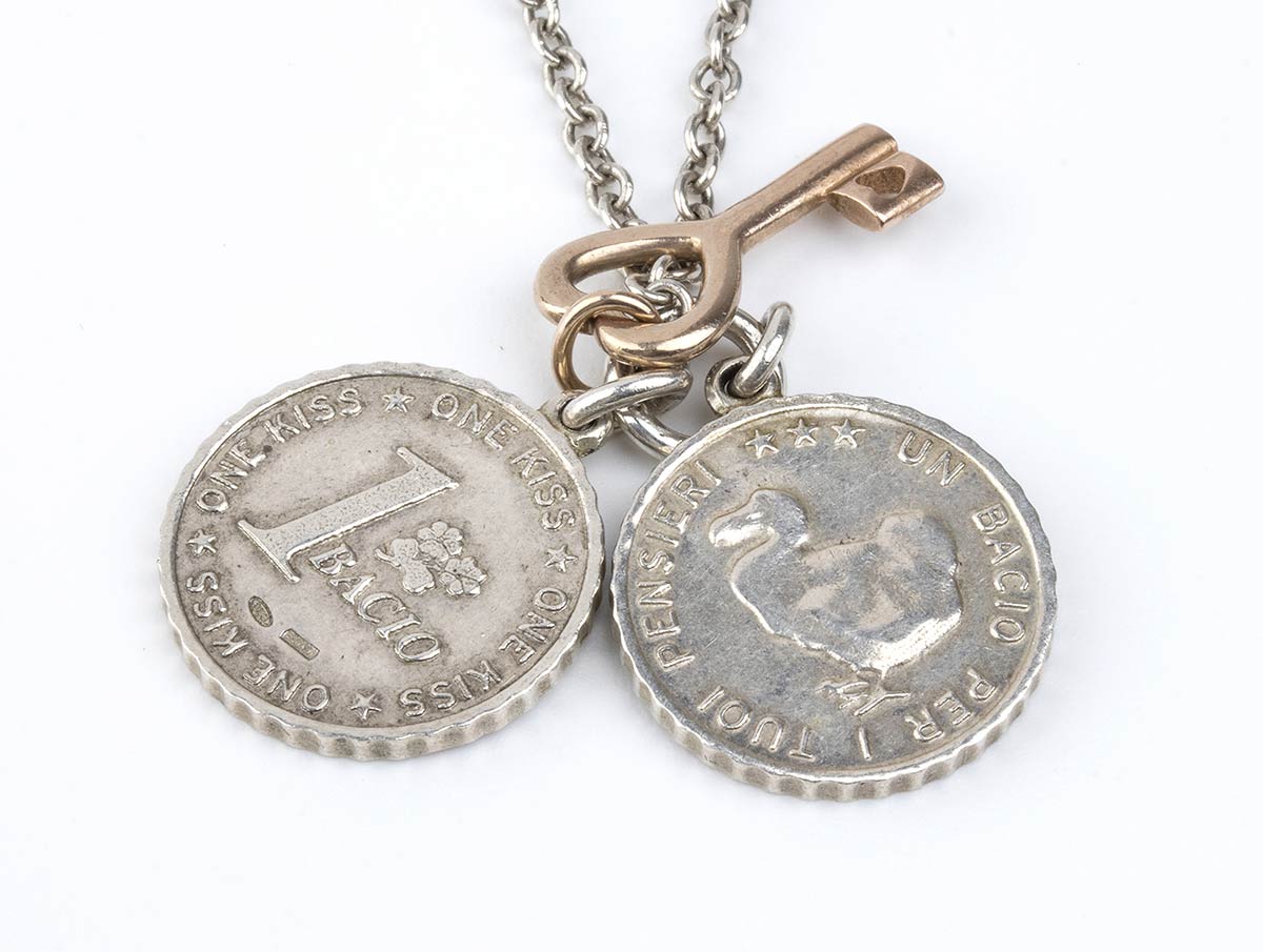 catena e due pendenti moneta in argento 925/1000, un pendente a forma di chiave in oro rosa 14k.