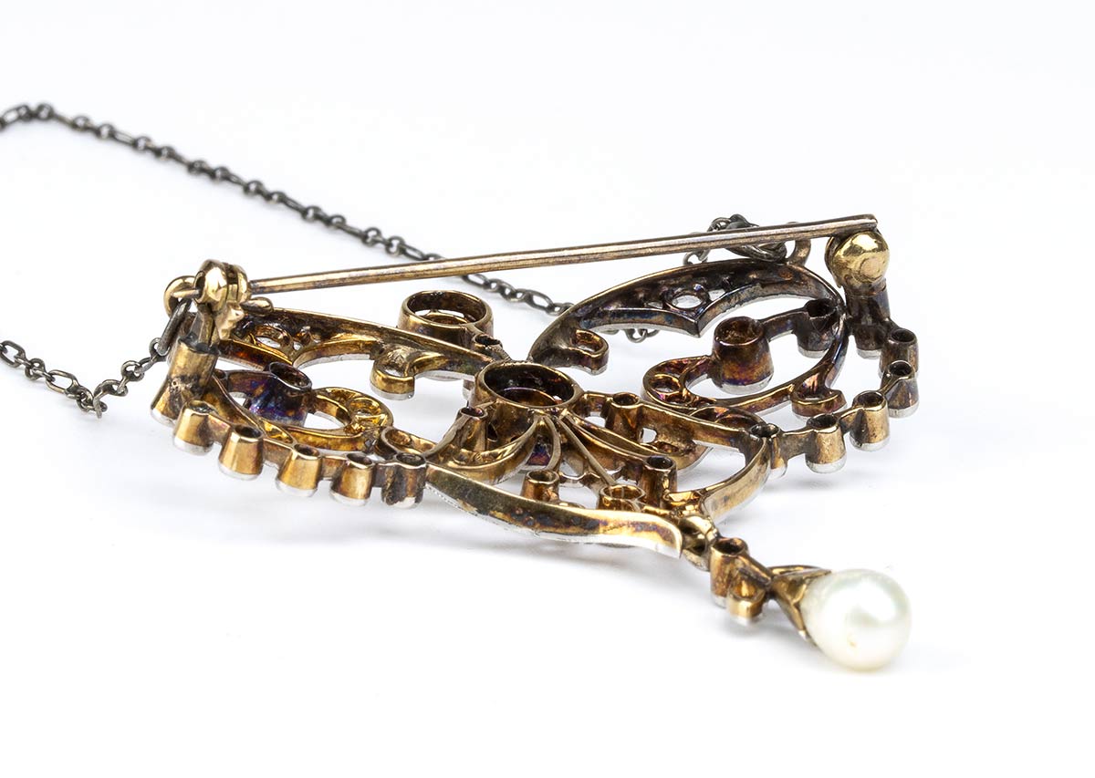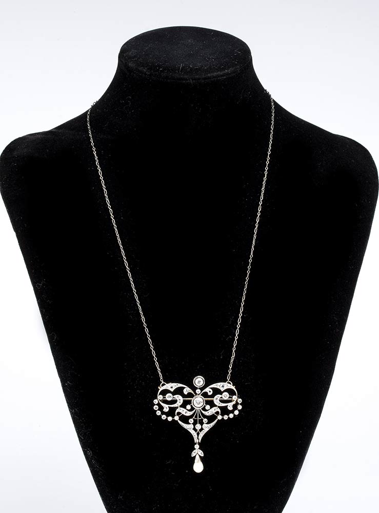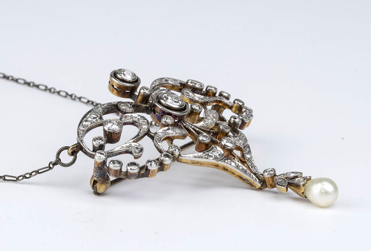 Girocollo in argento e centrale-spilla liberty con diamanti e perla pendente - fine XIX secolo