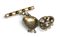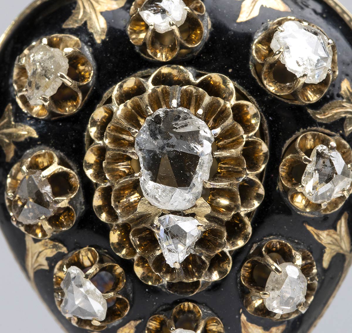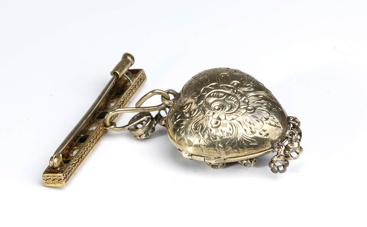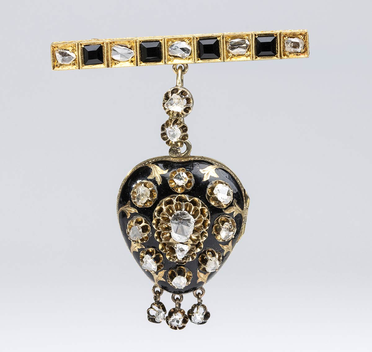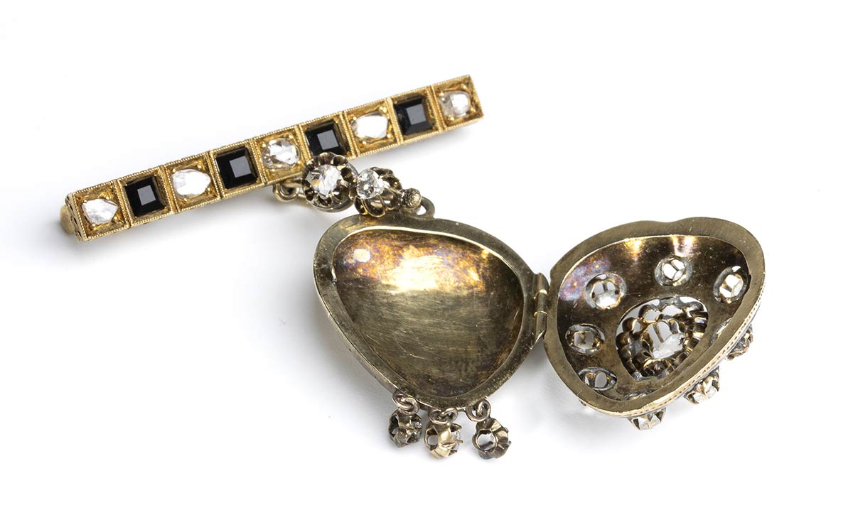 spilla a barretta incastonata con diamanti taglio a rosa ed onice, a cui è sospeso un pendente a forma di cuore il cui interno può contenere e nascondere una foto, un foglietto, un piccolo fiore, una piccola pianta, decorato con smalto nero e diamanti taglio a rosa.