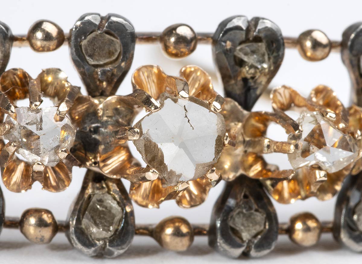 oro giallo 14k ed argento, incastonata con diamamti taglio a rosa.