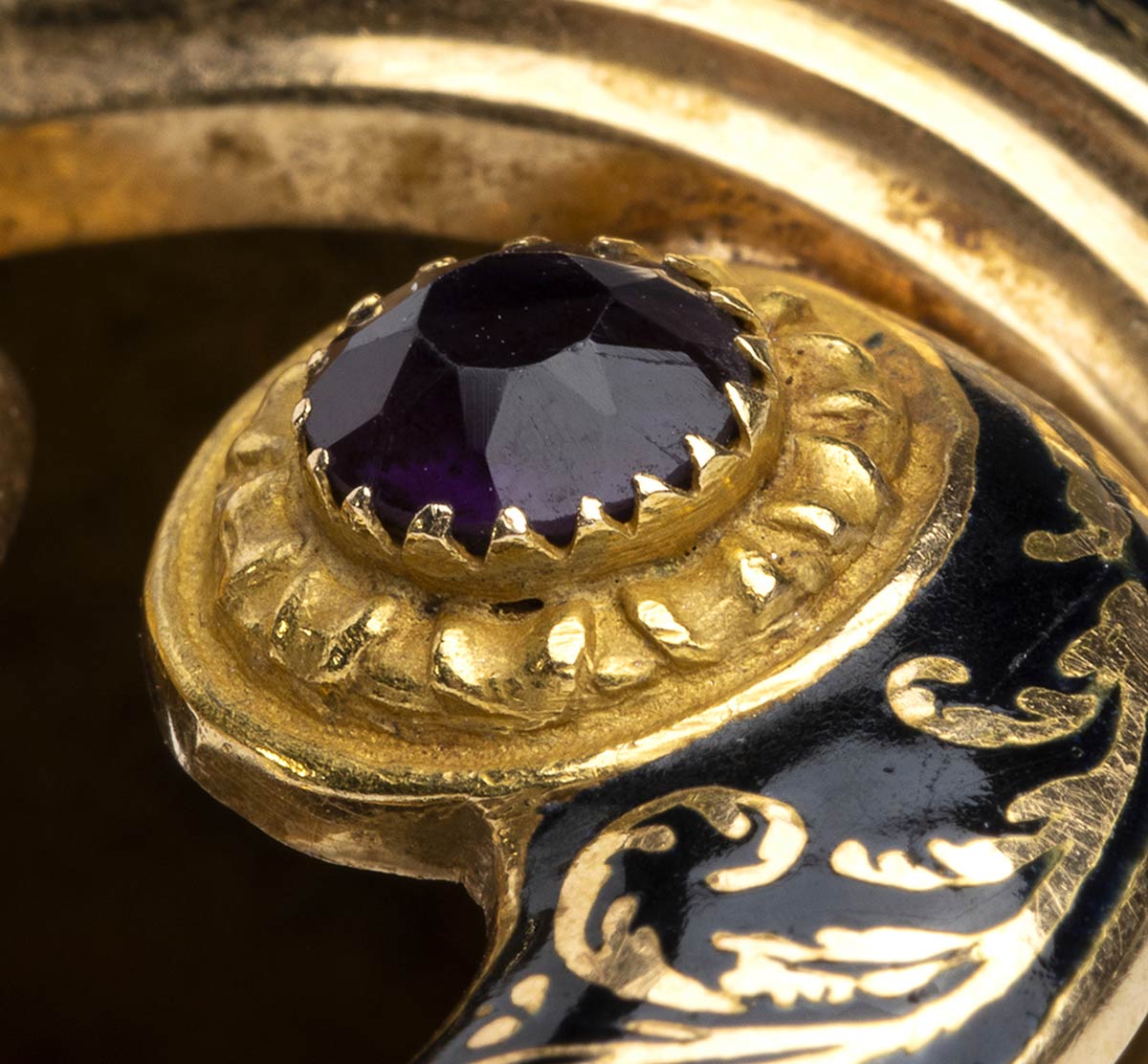 in oro giallo, finemente smaltato e inciso con volute fogliate e incastonato con granati.