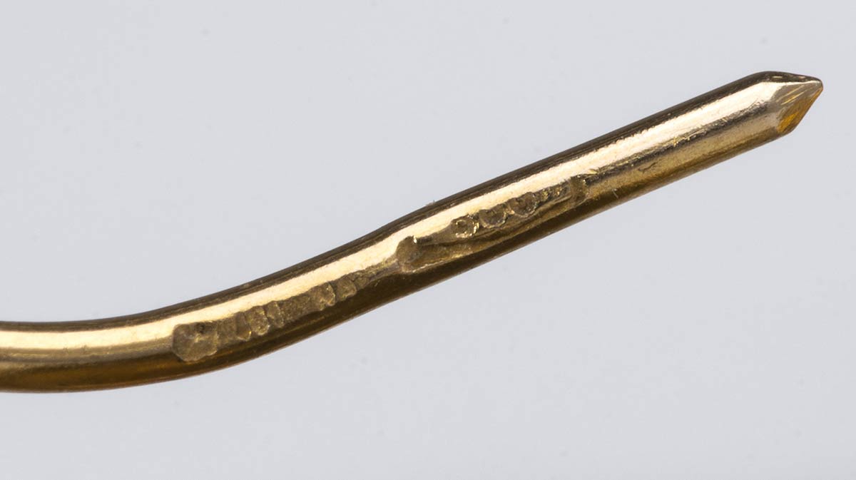 oro giallo 14k, il pendente a forma di goccia sagomata presenta un motivo vegetale a volute. Il gancio di raccordo è di epoca piu recente, punzonato "500" - 461 NA".