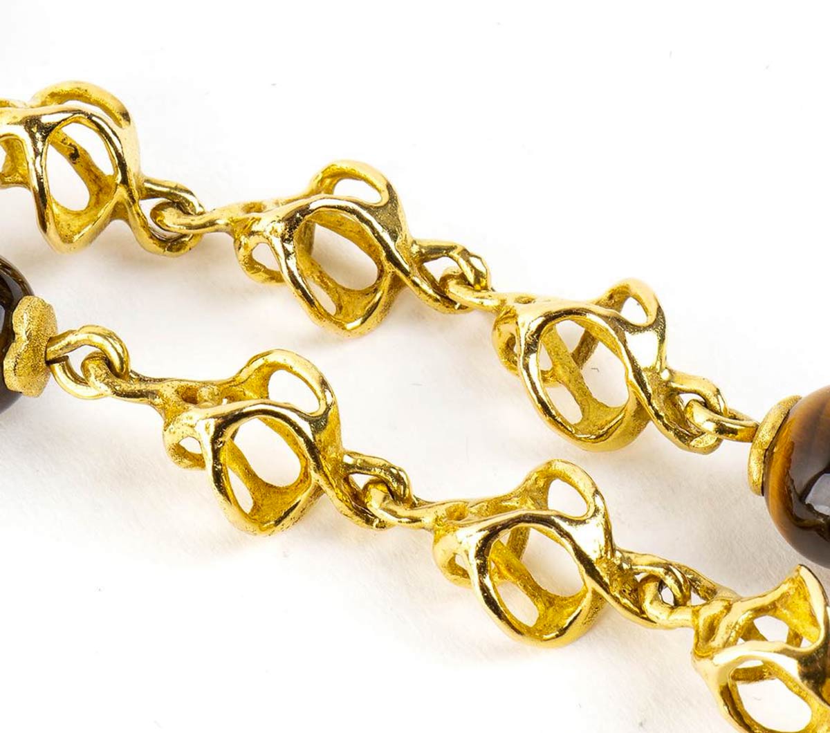 un filo di maglie a gabbietta stilizzate in oro giallo 18k, interrotto da sfere di quarzo occhio di tigre.