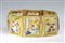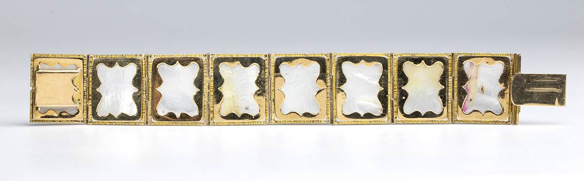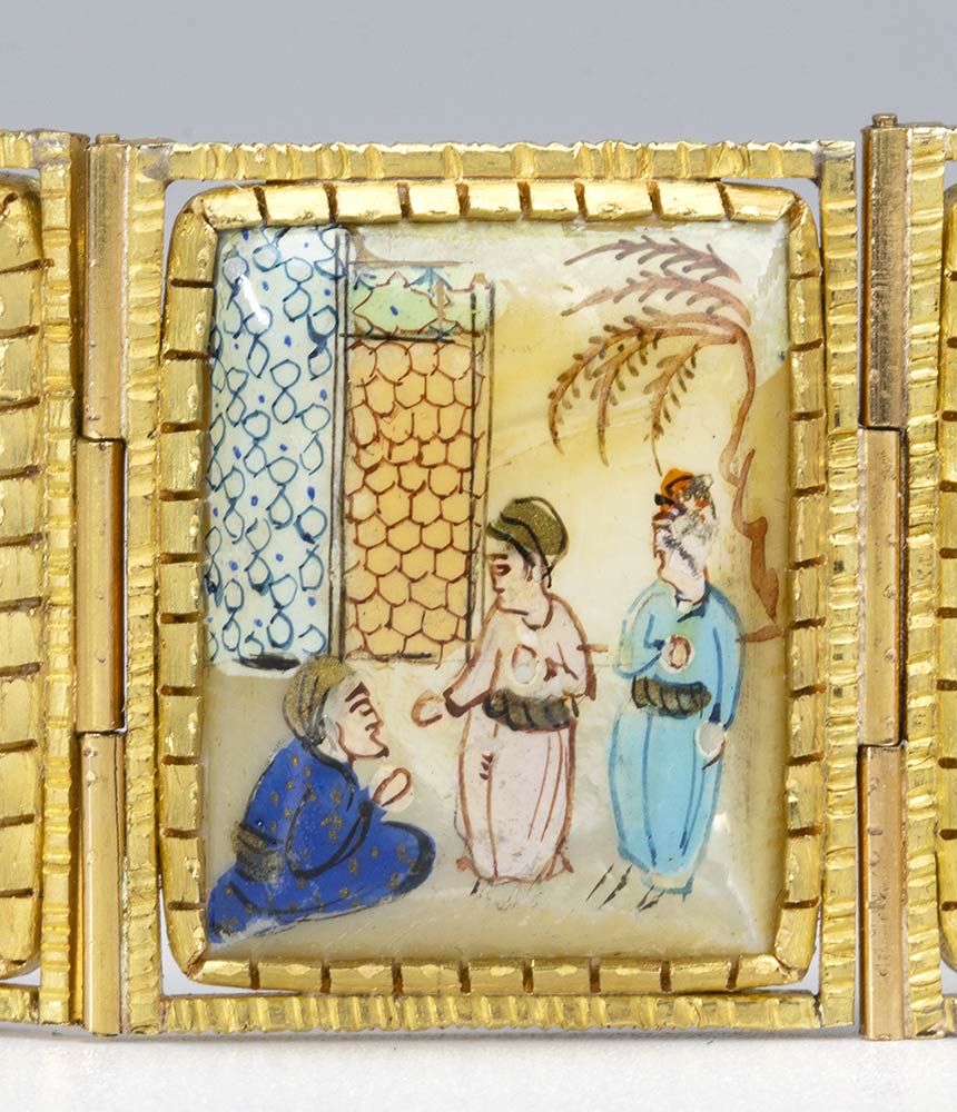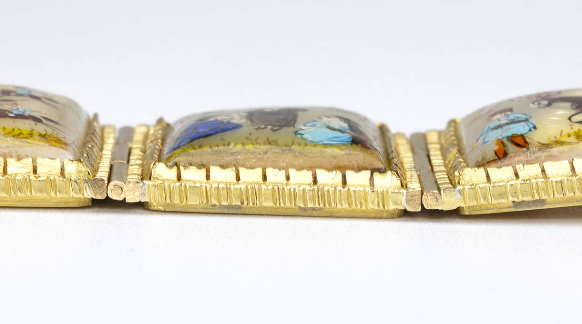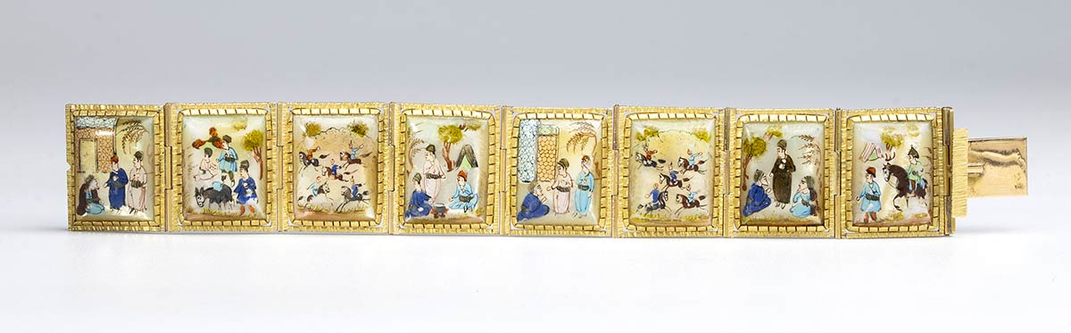 oro giallo 18k, maglie geometriche incastonate con elementi in madreperla decorati con disegni a soggetti orientali in smalto.