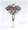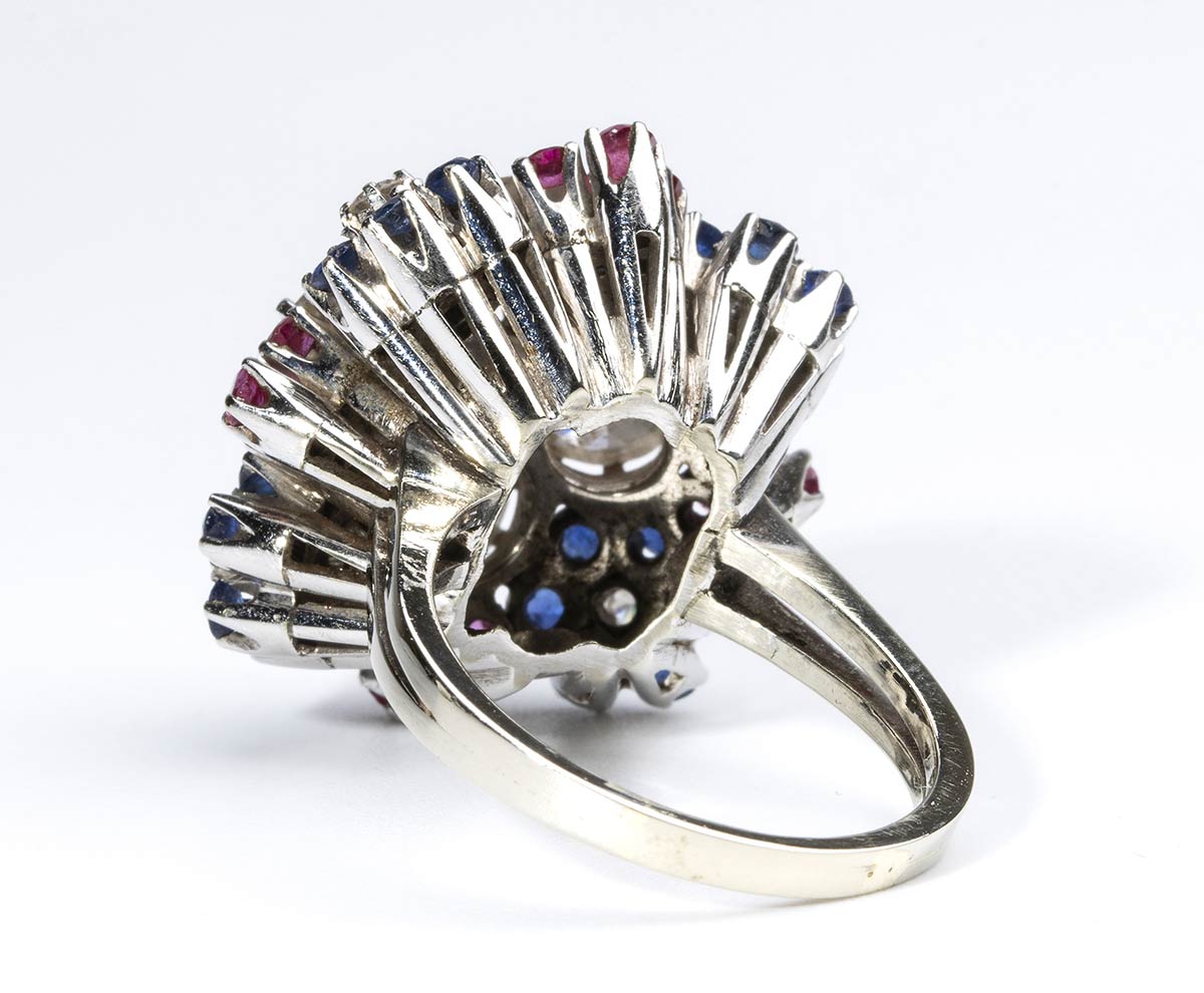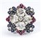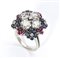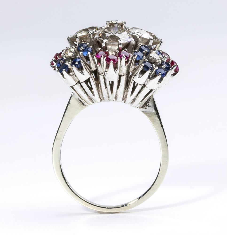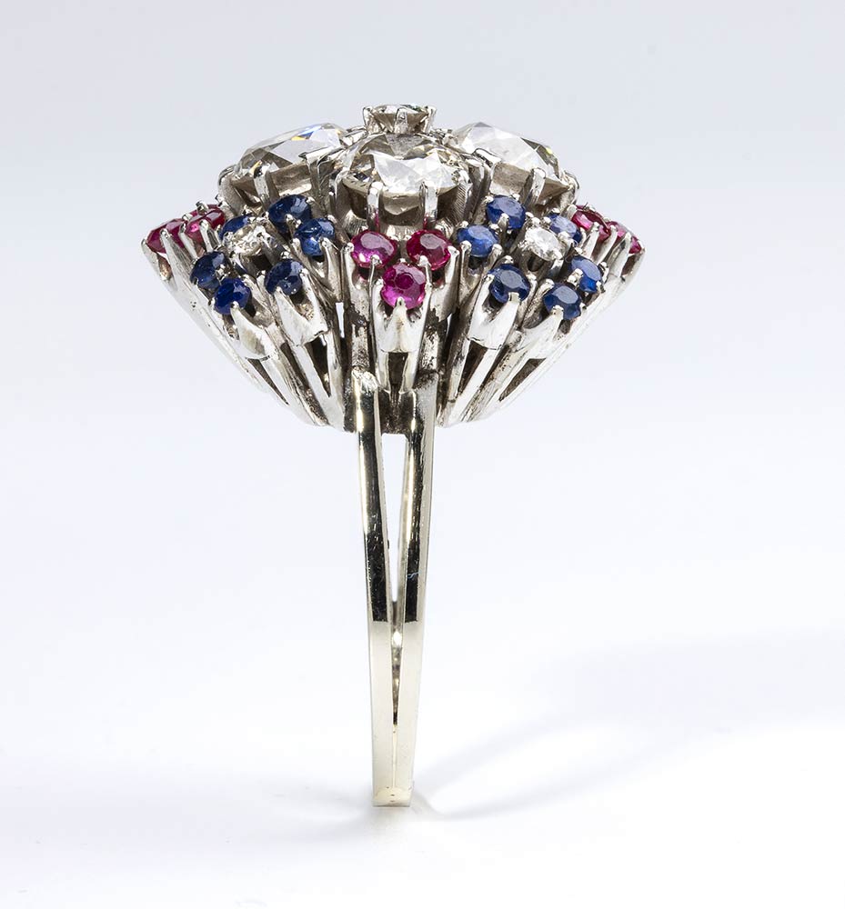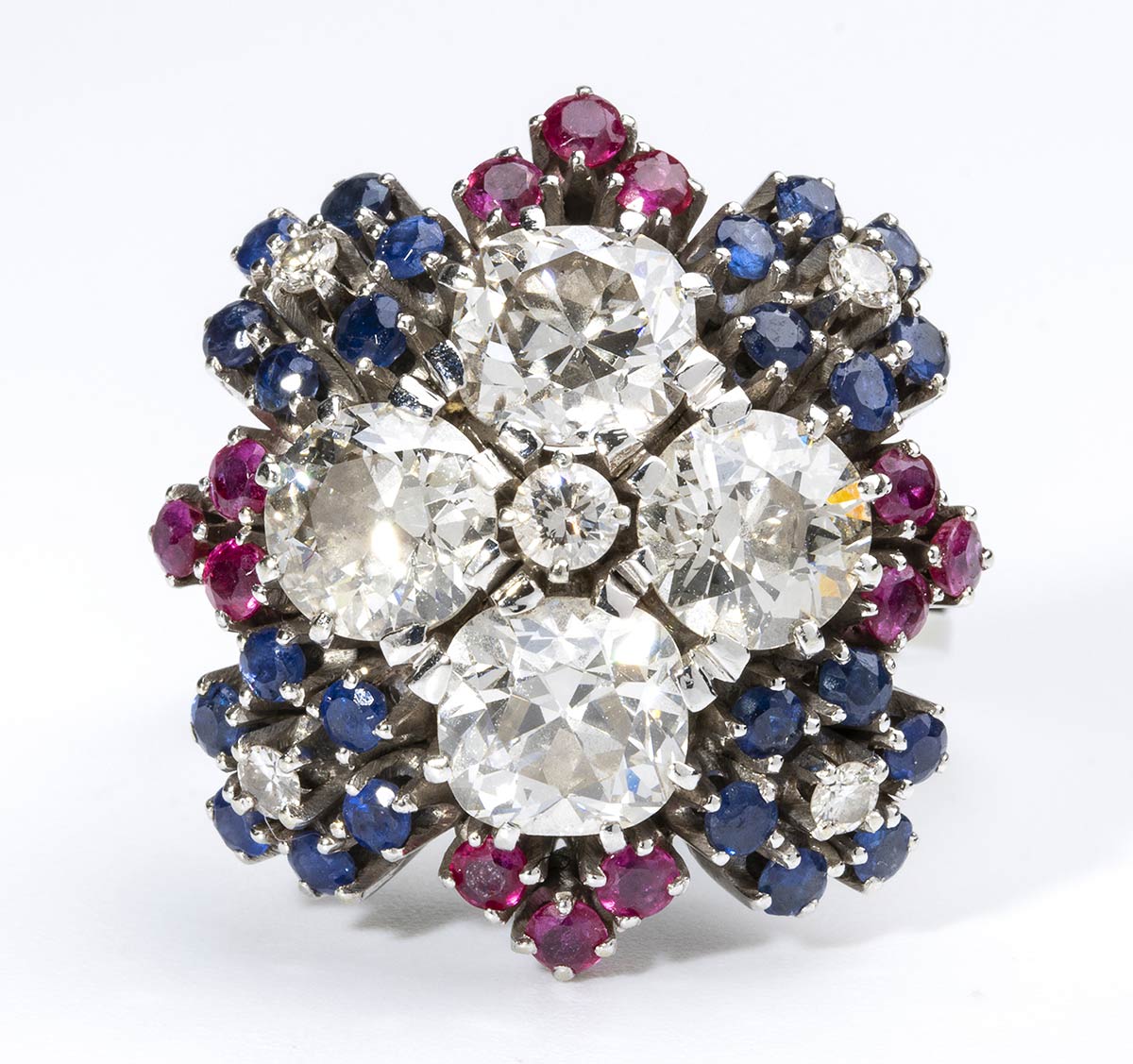 oro bianco 18k, a motivo di piccoli fiori in rubini zaffiri e brillanti, al centro quattro diamanti taglio old mine.