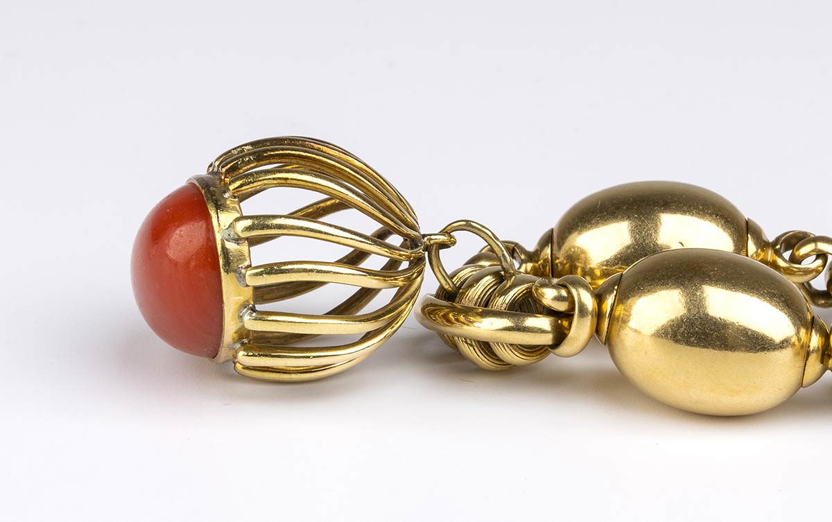 catena con maglie ad ovetto in oro giallo 18k. Pendente incastonato con cabochon di corallo Mediterraneo (corallium rubrum).