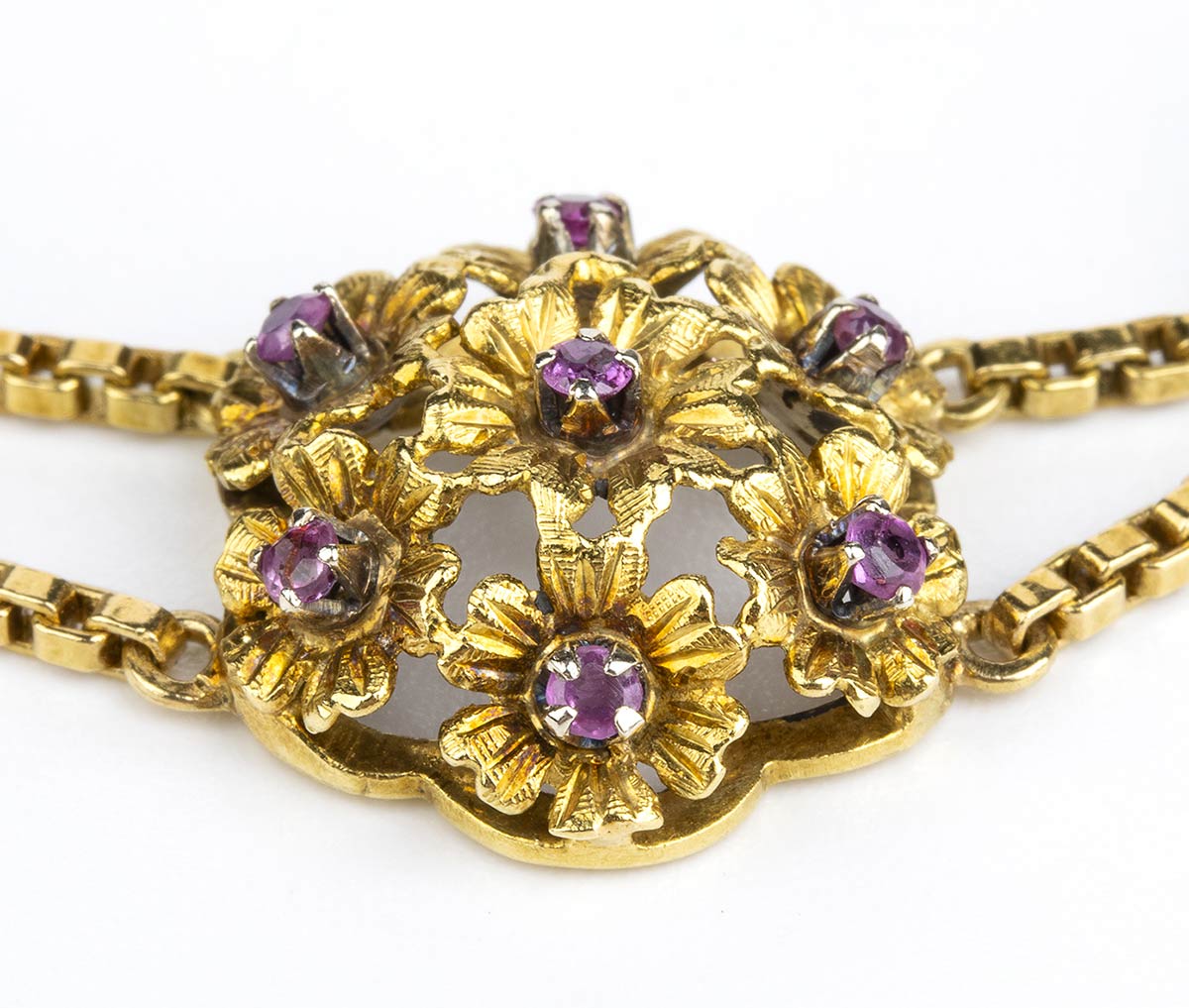 oro giallo 18k, con linea di elementi floreali decorati con rubini.