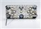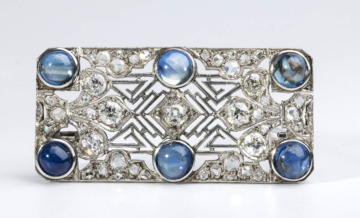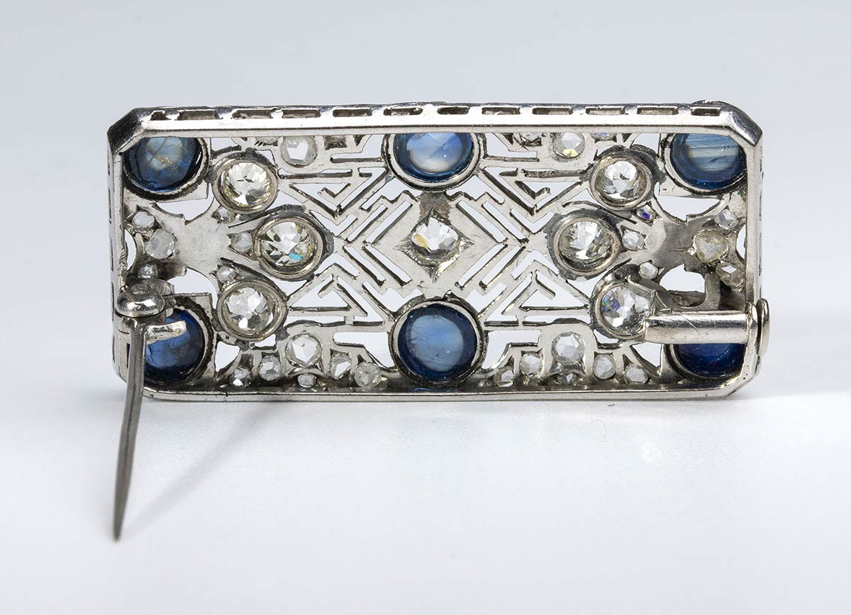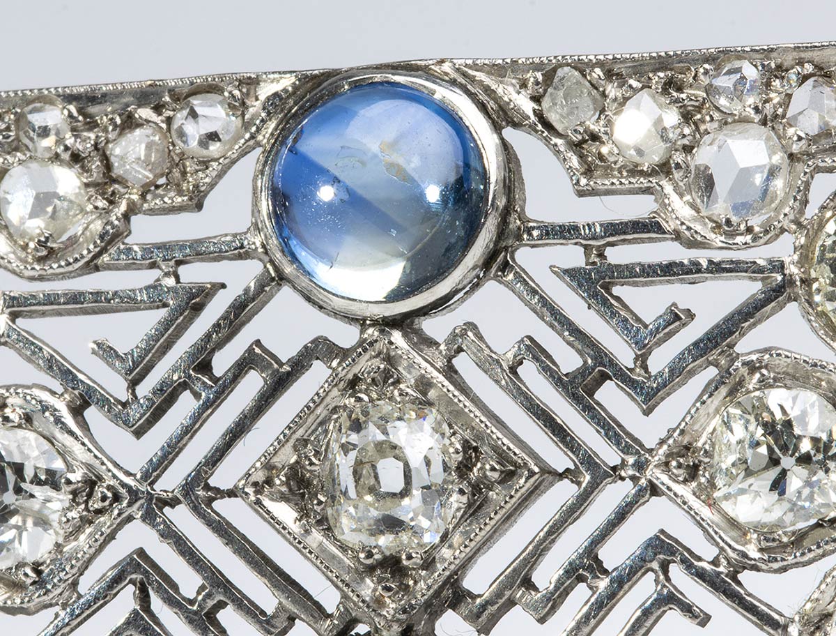 oro bianco 18k, di forma rettangolare traforata a motivi vegetali, incastonata con diamanti taglio a rosa e taglio old mine, 4 zaffiri cabochon agli angoli.