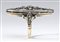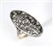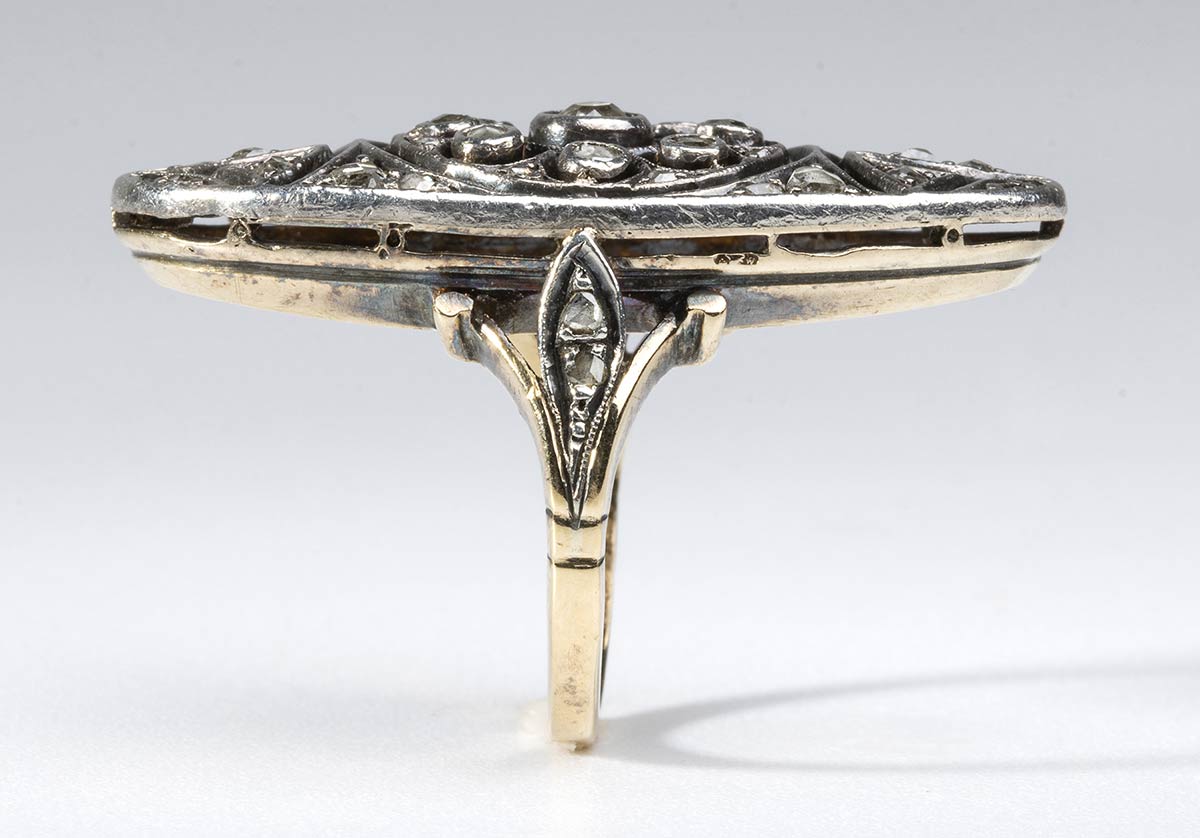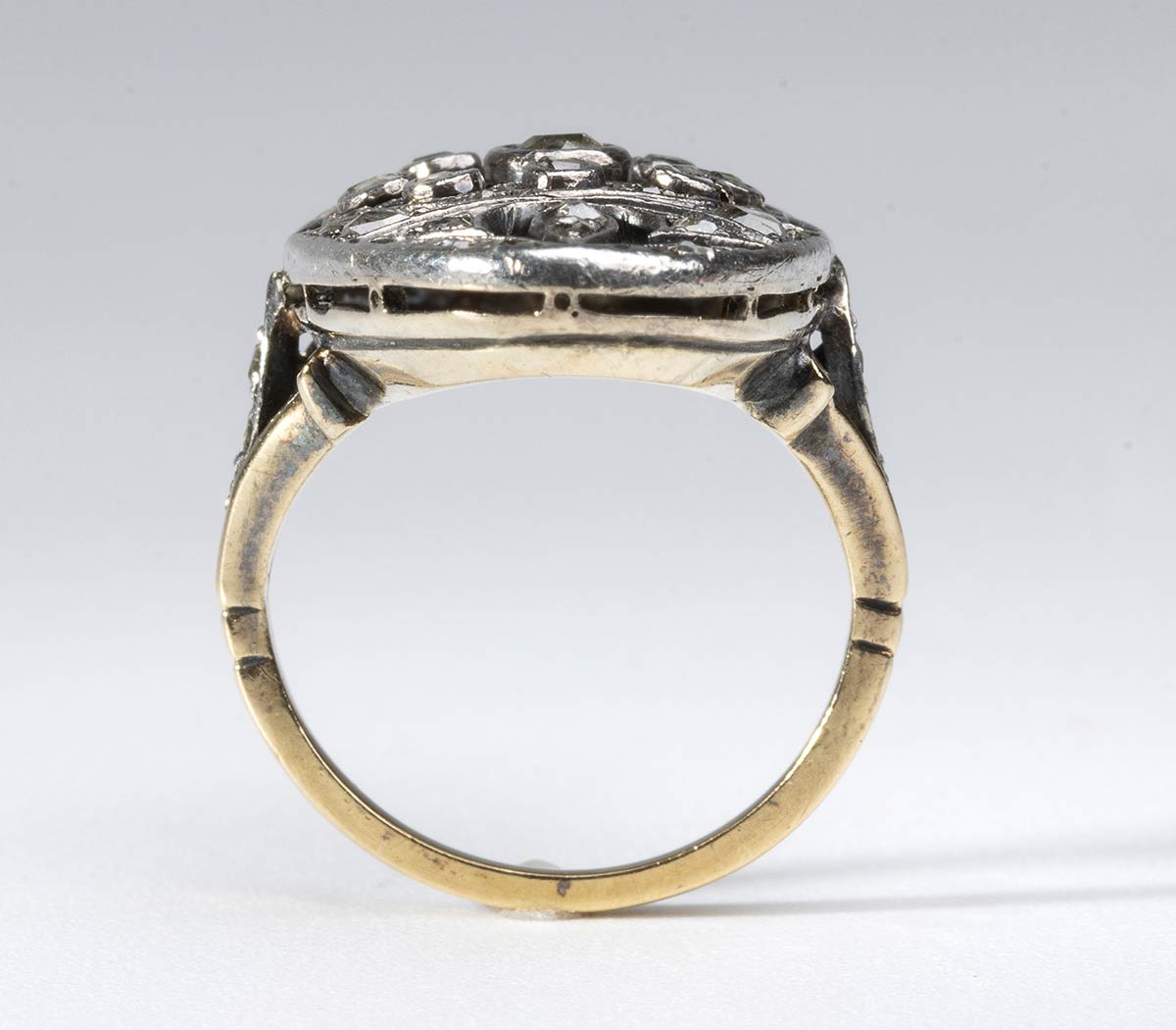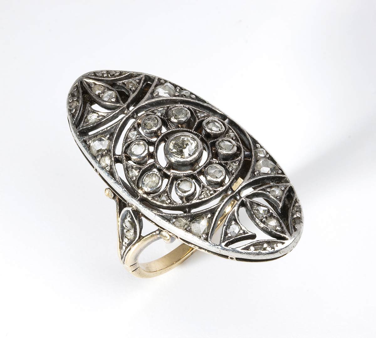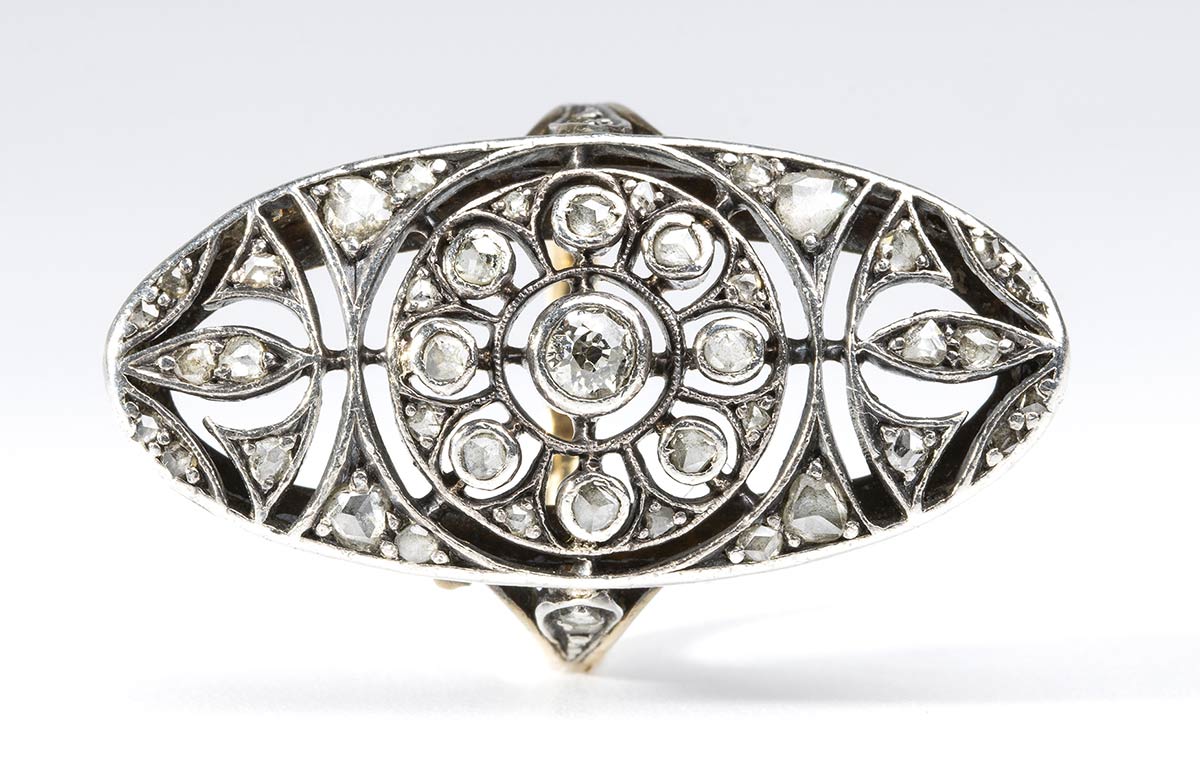 oro giallo 18k ed argento, di forma ovale traforato a motivi floreali, incastonato con diamanti taglio a rosa.
