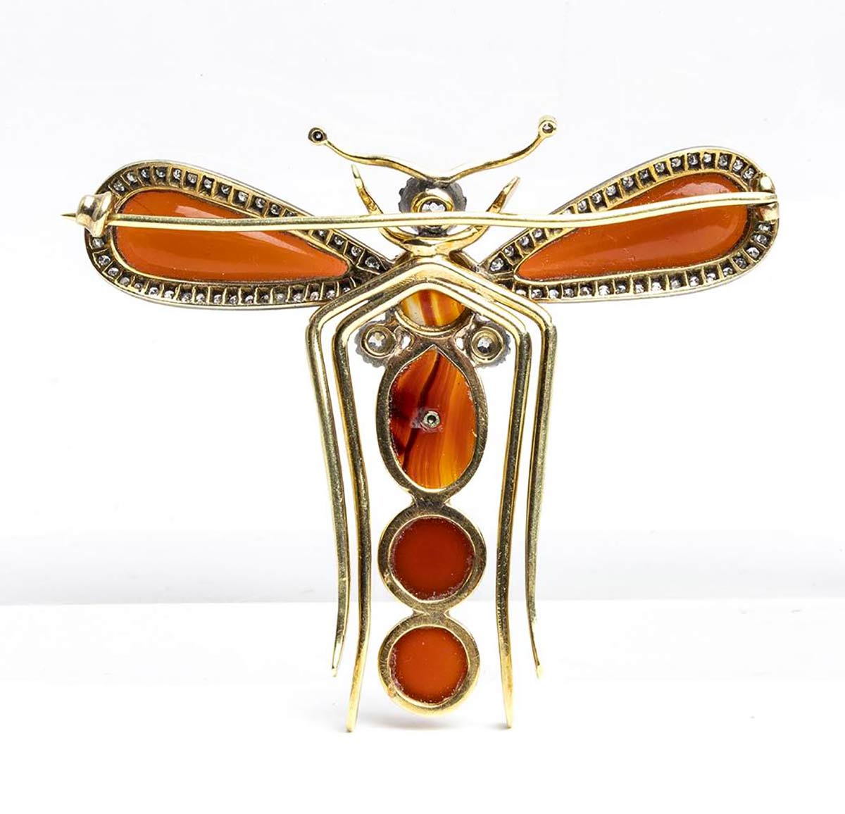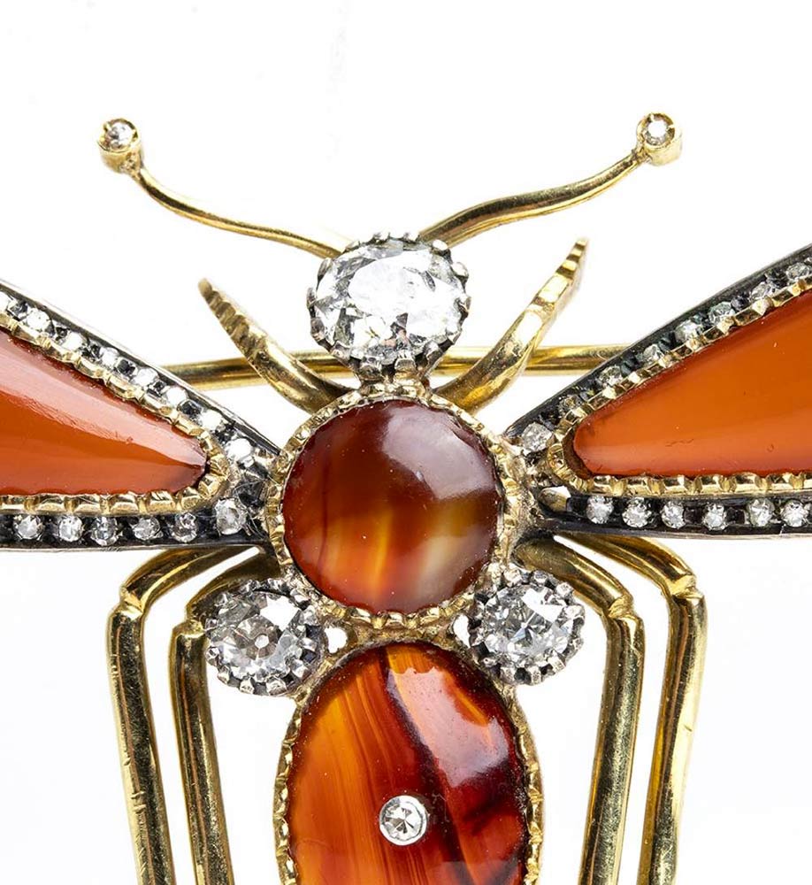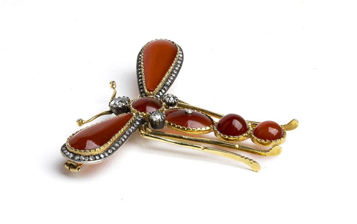 Spilla in oro ed argento raffigurante una libellula con corniola e diamanti