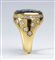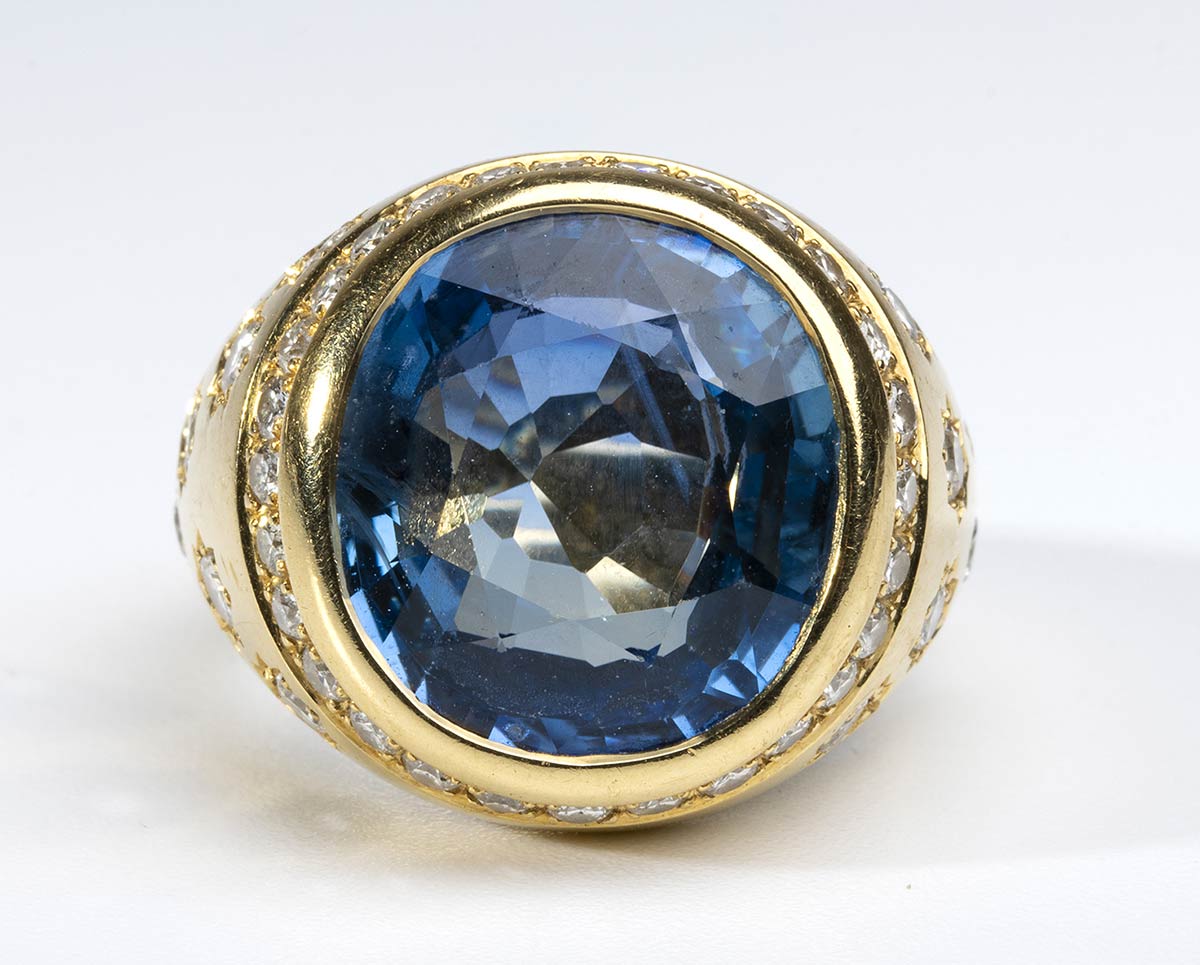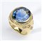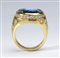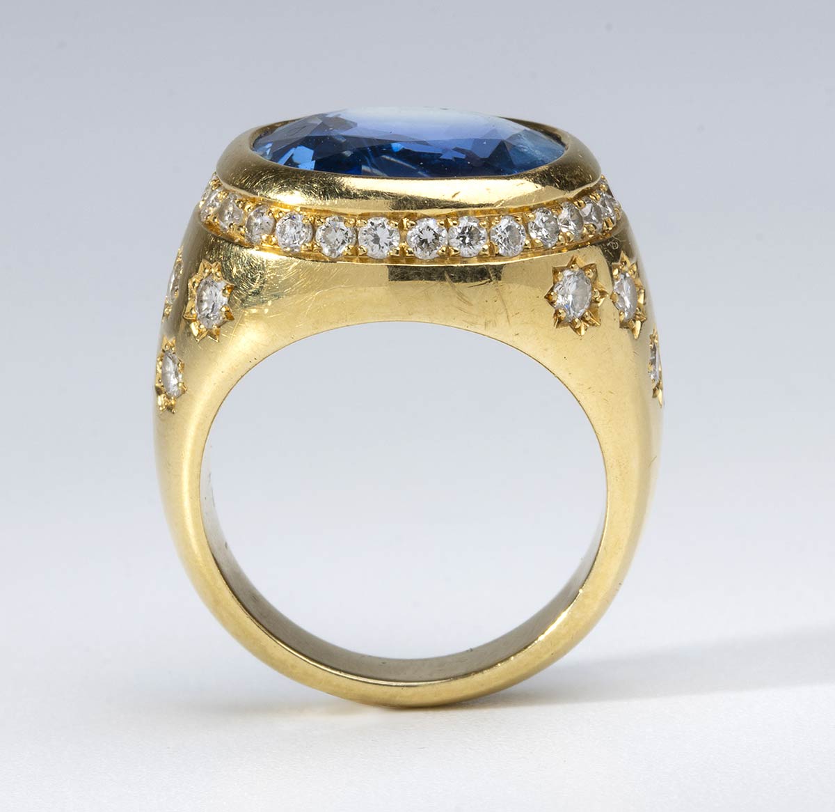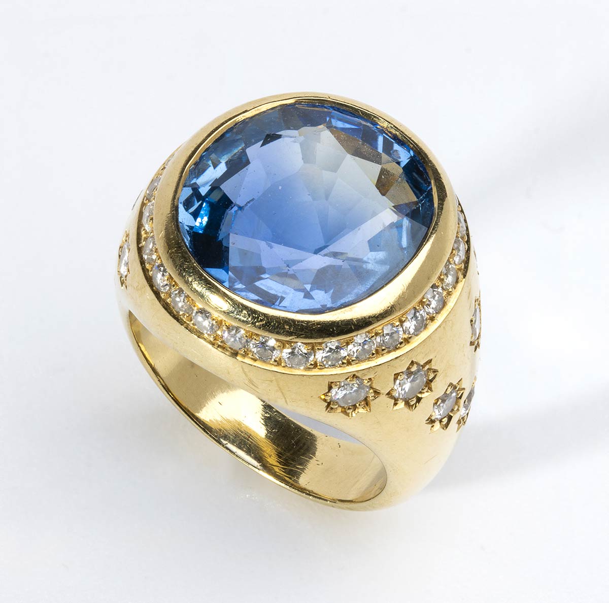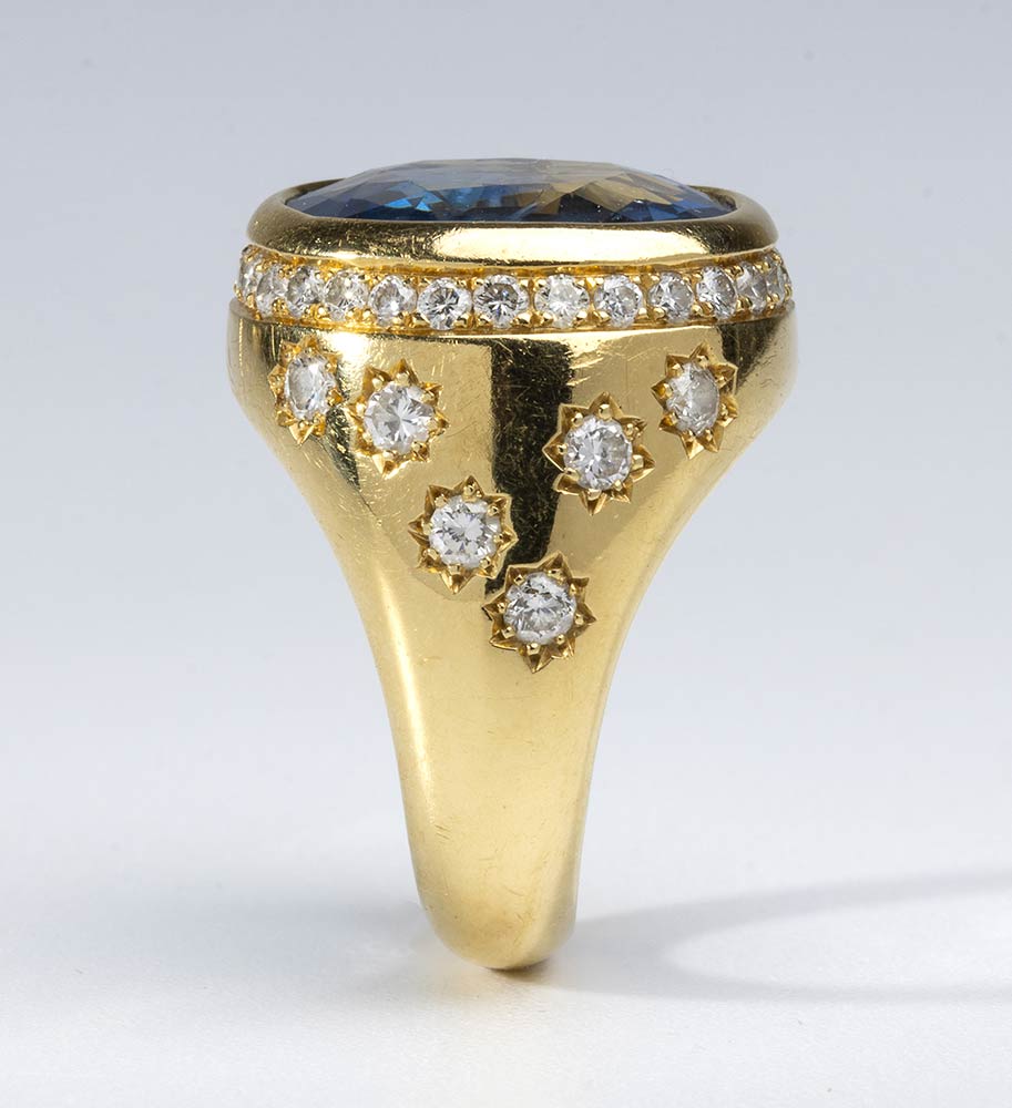 oro giallo 18k, incastonato con zaffiro contornato da diamanti.