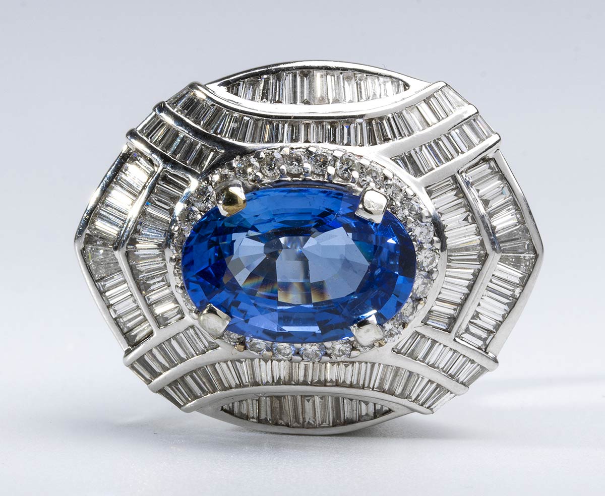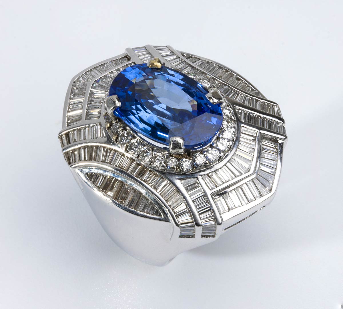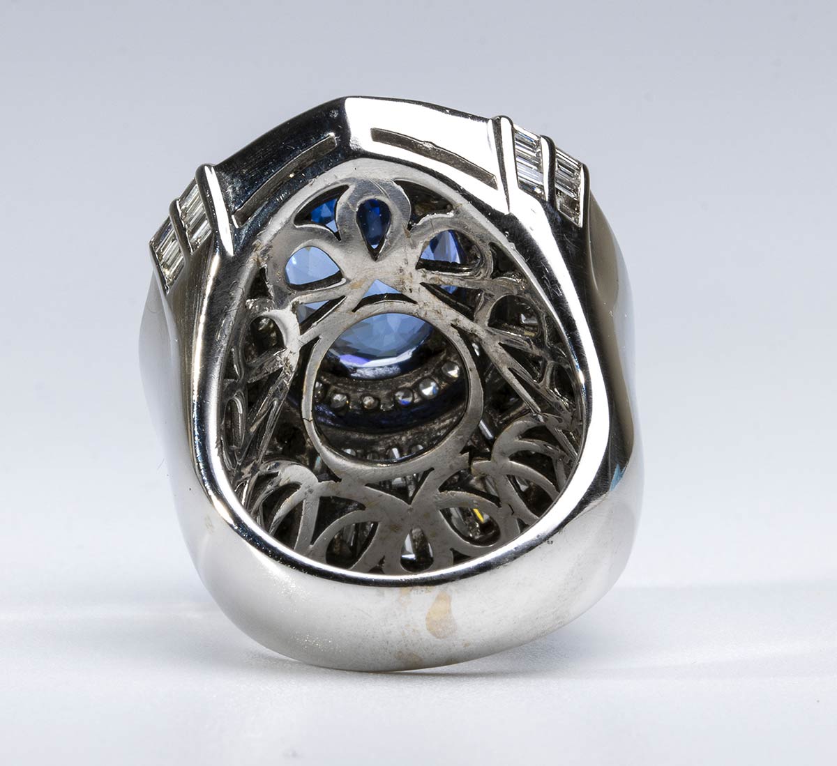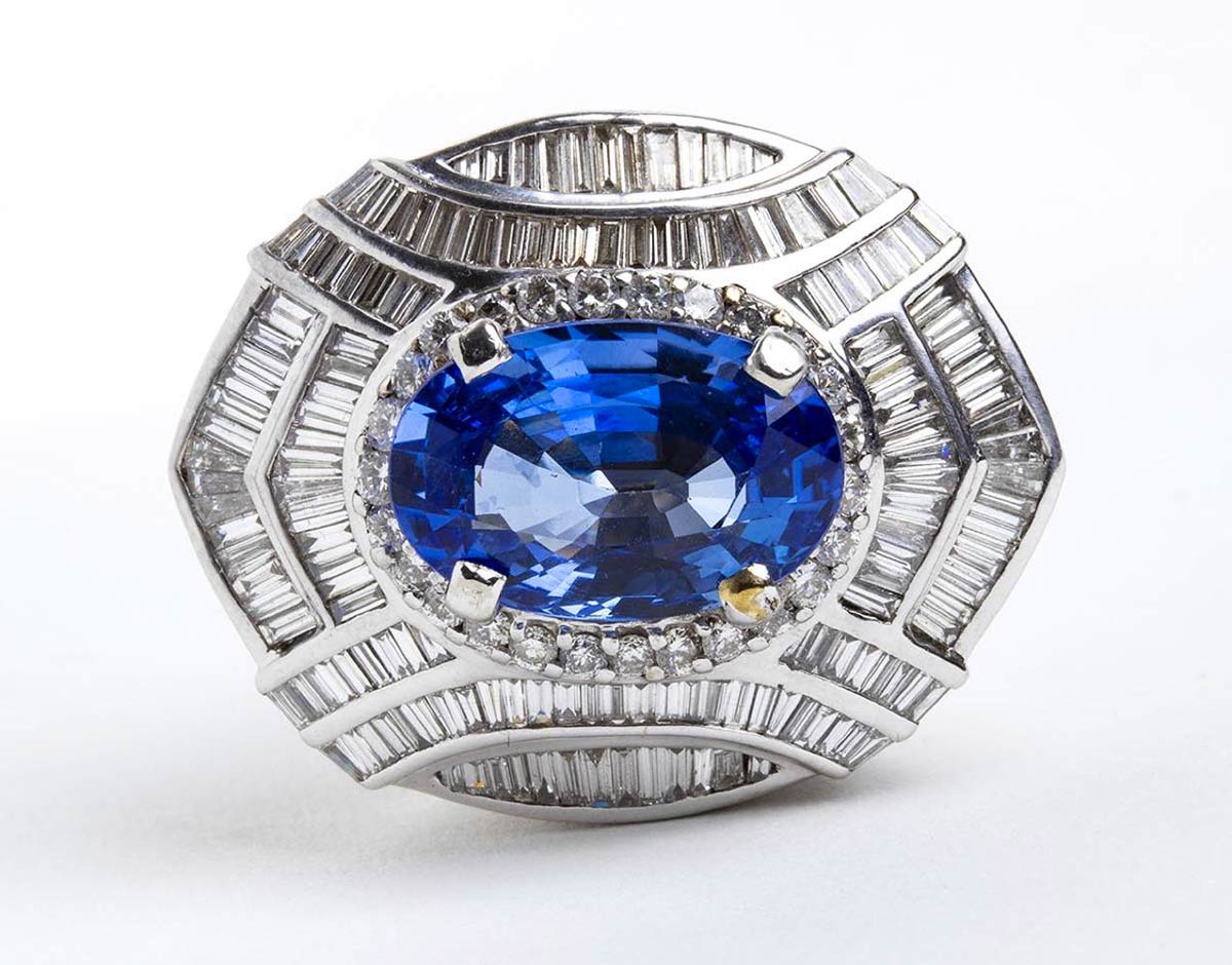 oro bianco 18k, incastonato con zaffiro ovale 9,63 ct circa incorniciato da diamanti rotondi taglio brillante, da nastri in diamanti taglio baguette e taglio tapered 6,63 ct circa, E-F, VVS-VS. Punzonato "750".