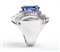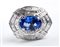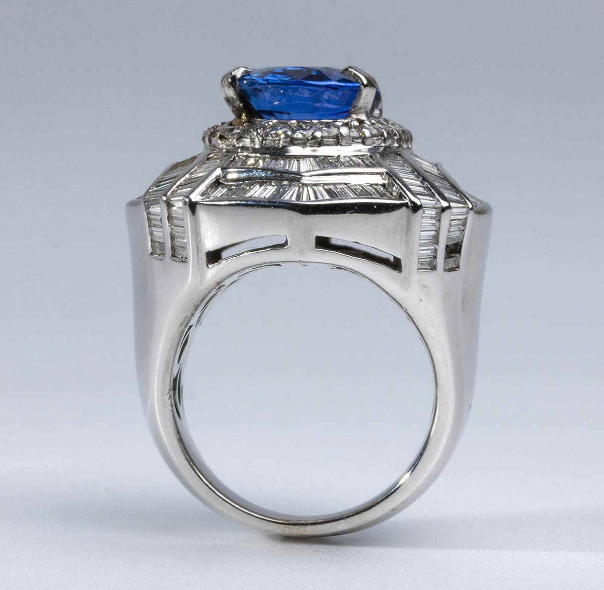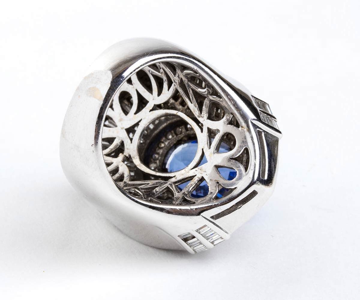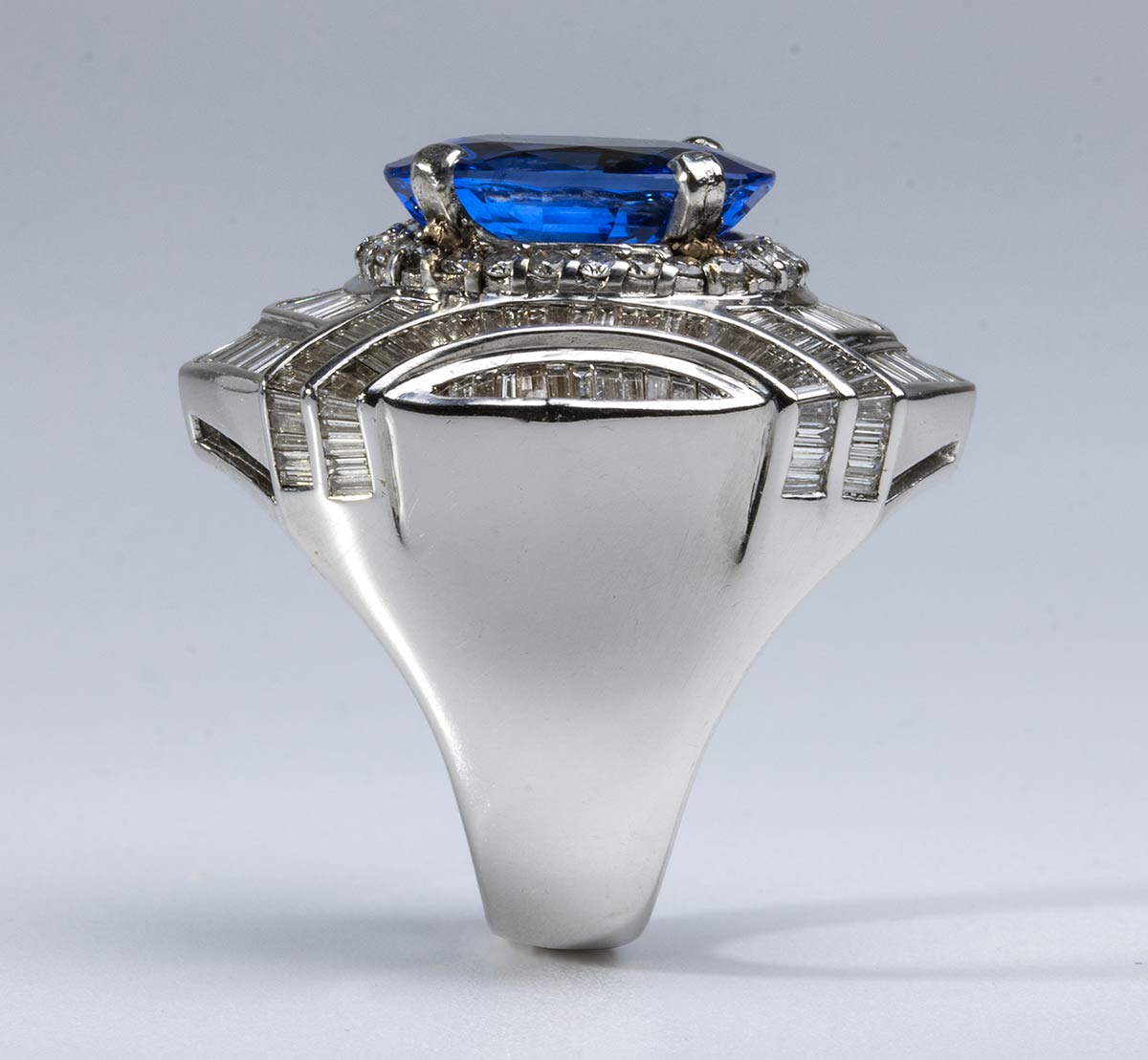 oro bianco 18k, incastonato con zaffiro ovale 9,63 ct circa incorniciato da diamanti rotondi taglio brillante, da nastri in diamanti taglio baguette e taglio tapered 6,63 ct circa, E-F, VVS-VS. Punzonato "750".